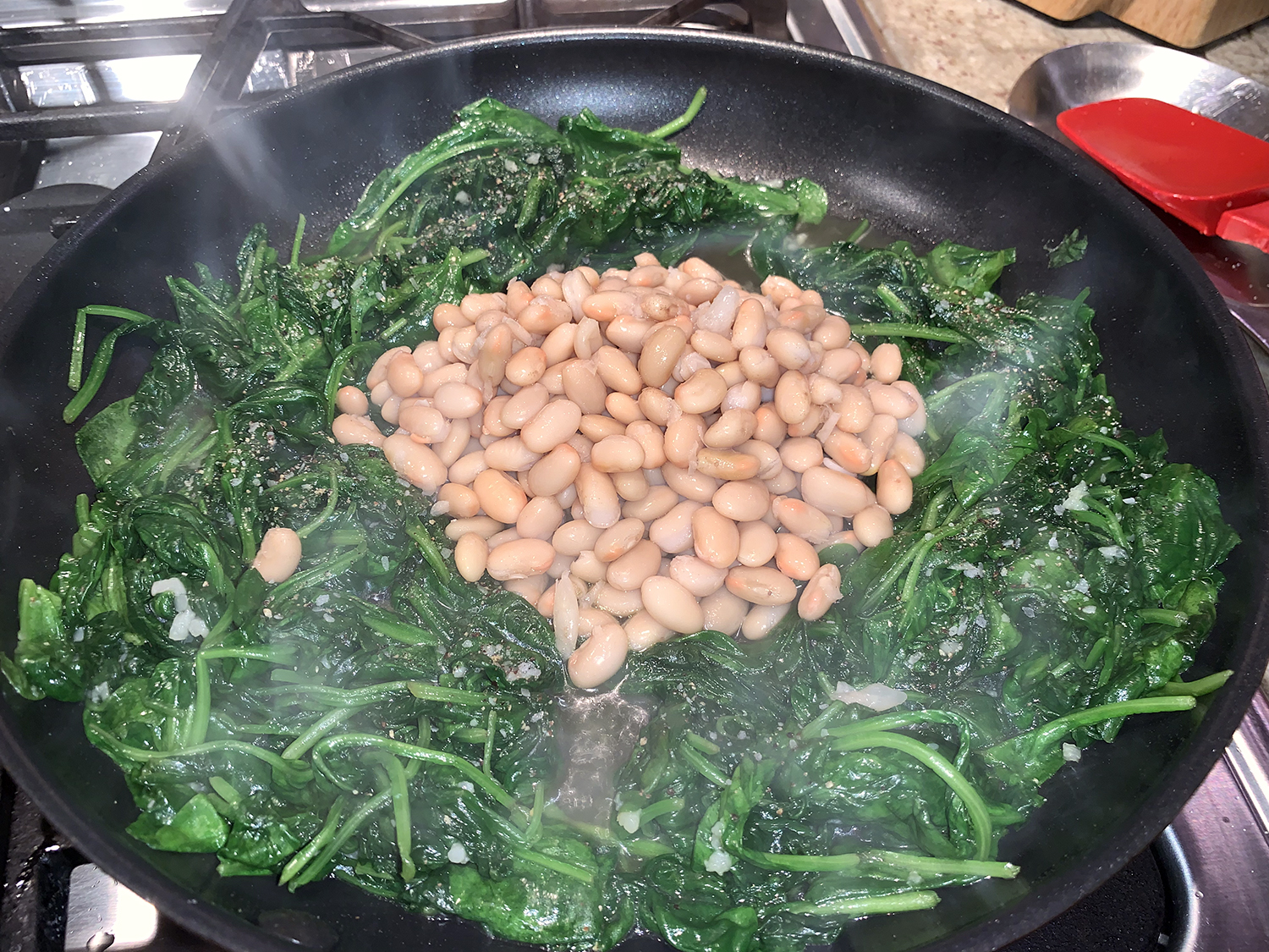 - Add the beans and season with salt and pepper, mix until combined. Cook until the beans are warm, about 2 minutes; remove from heat.