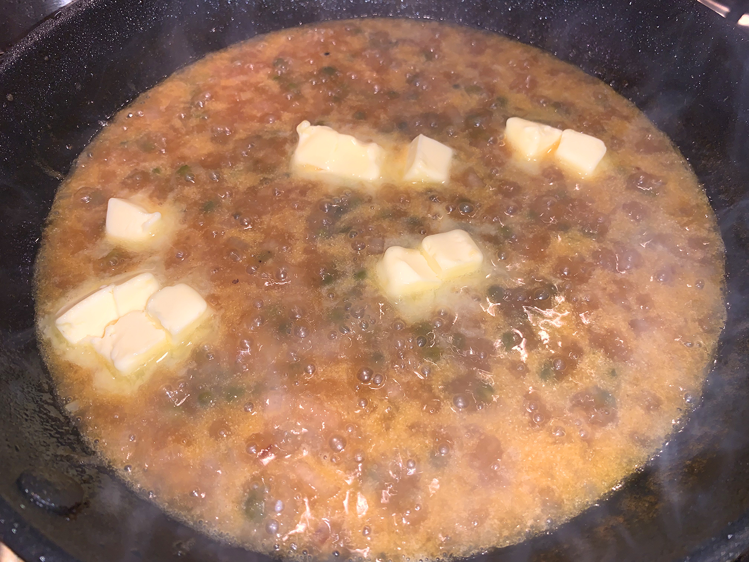 - Add the broth, wine, lemon juice and capers. Cook, stirring occasionally, until the liquid has reduced slightly, about 4 to 5 minutes. Add the butter, and when melted, add 2 tablespoons of parsley and stir.