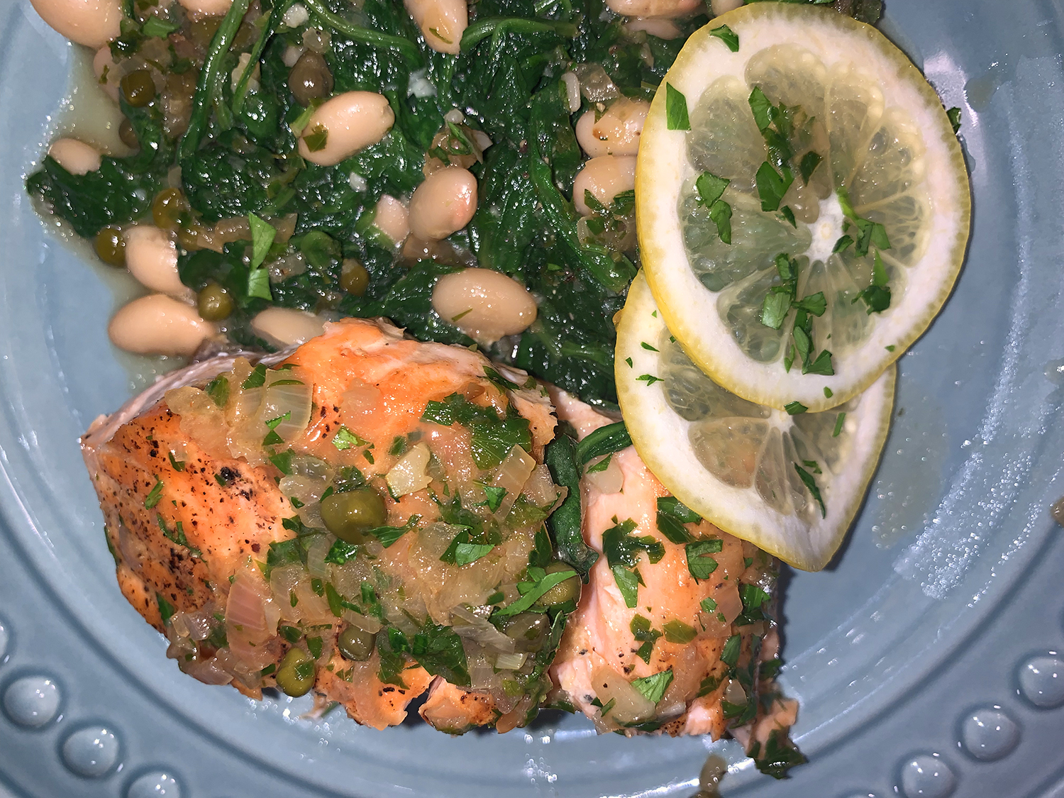 Salmon Piccata with Wilted Spinach and Navy Beans
