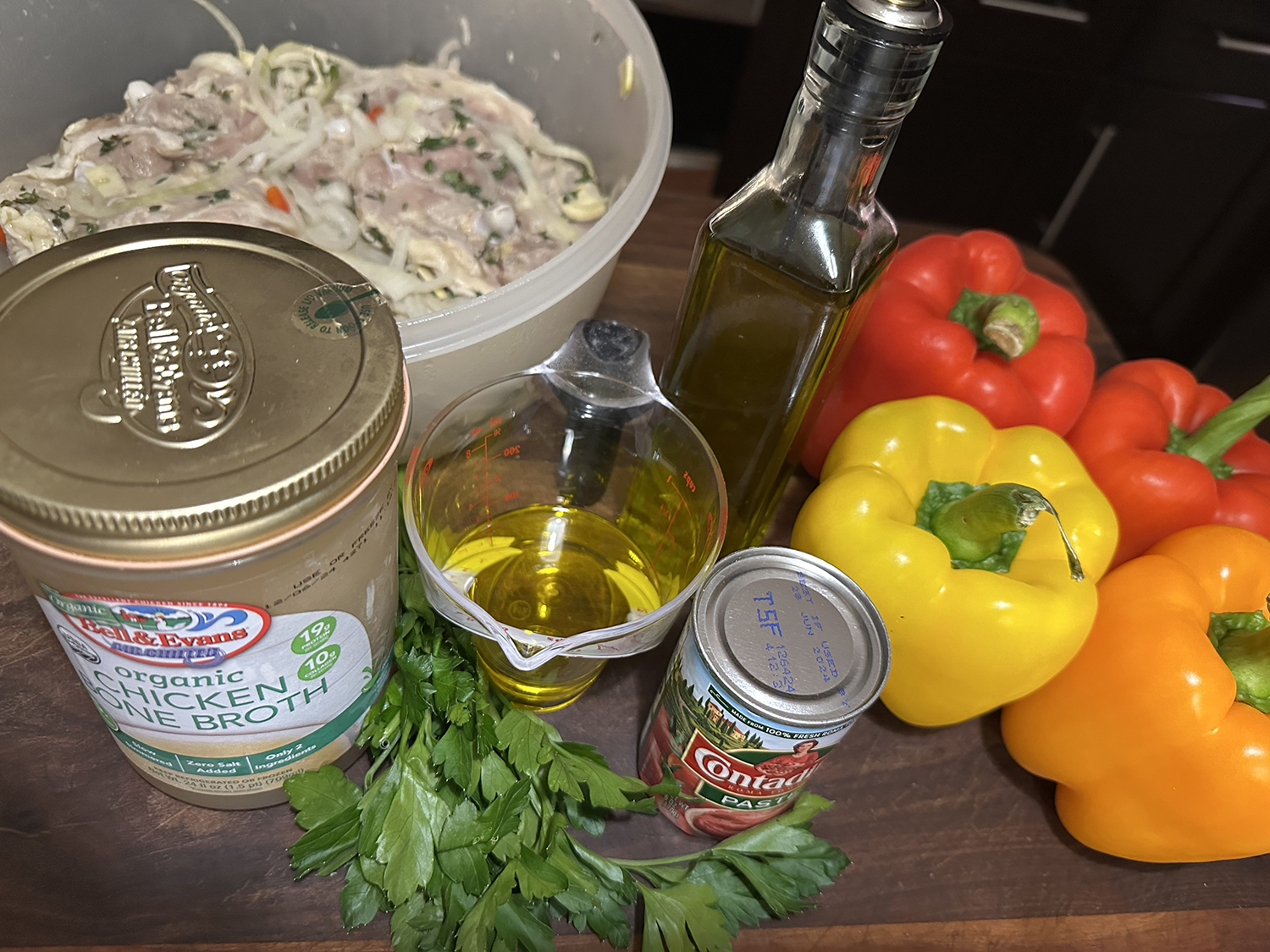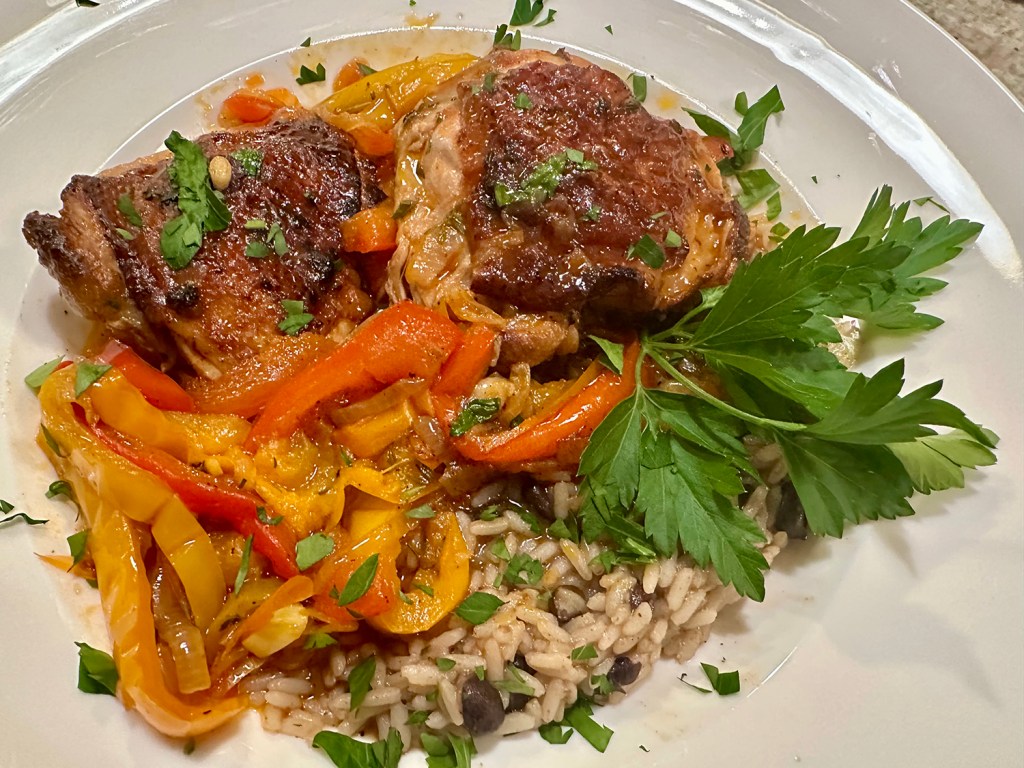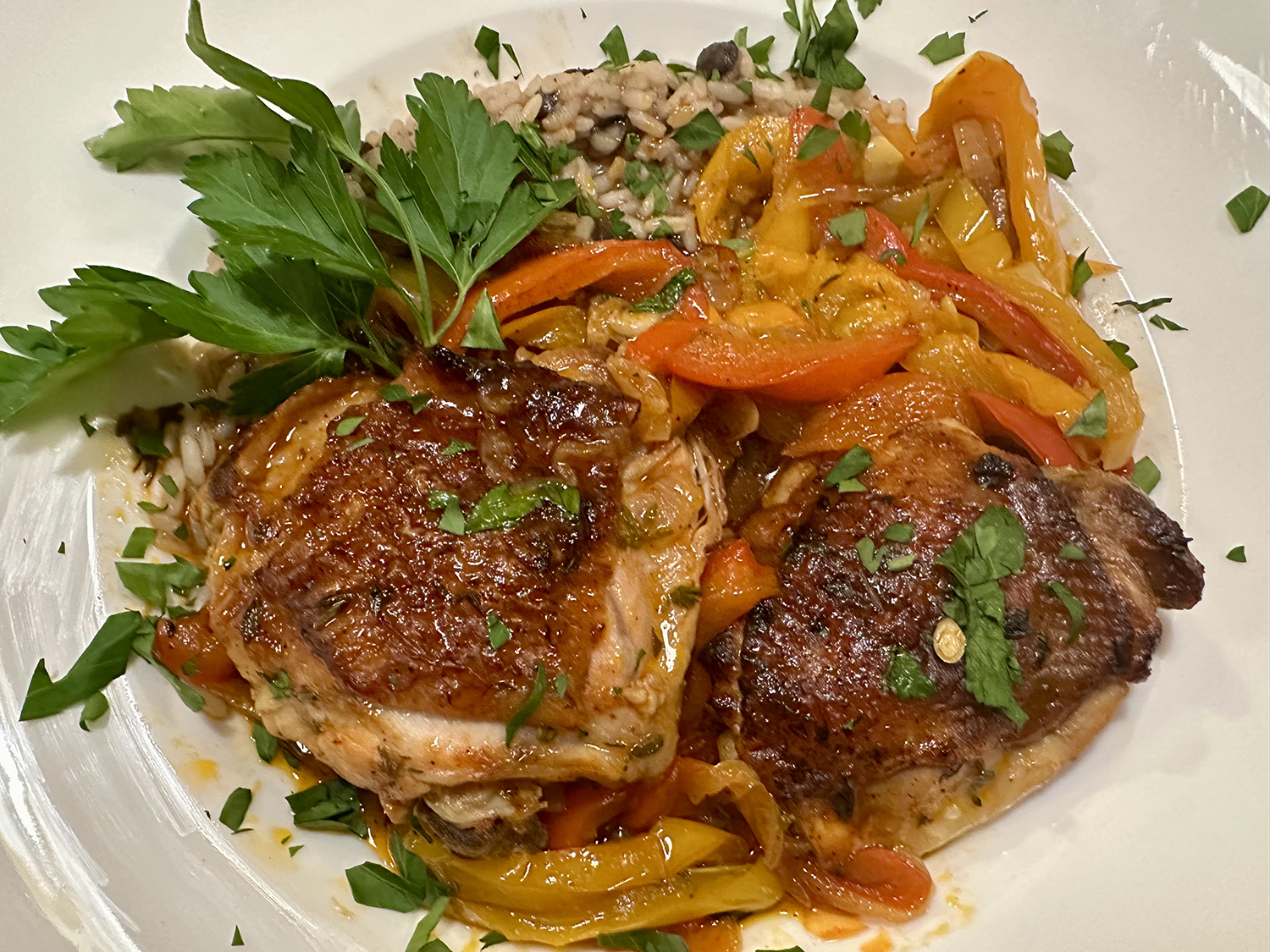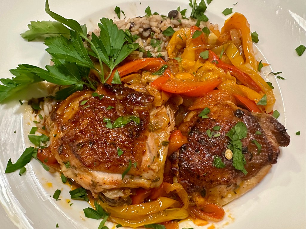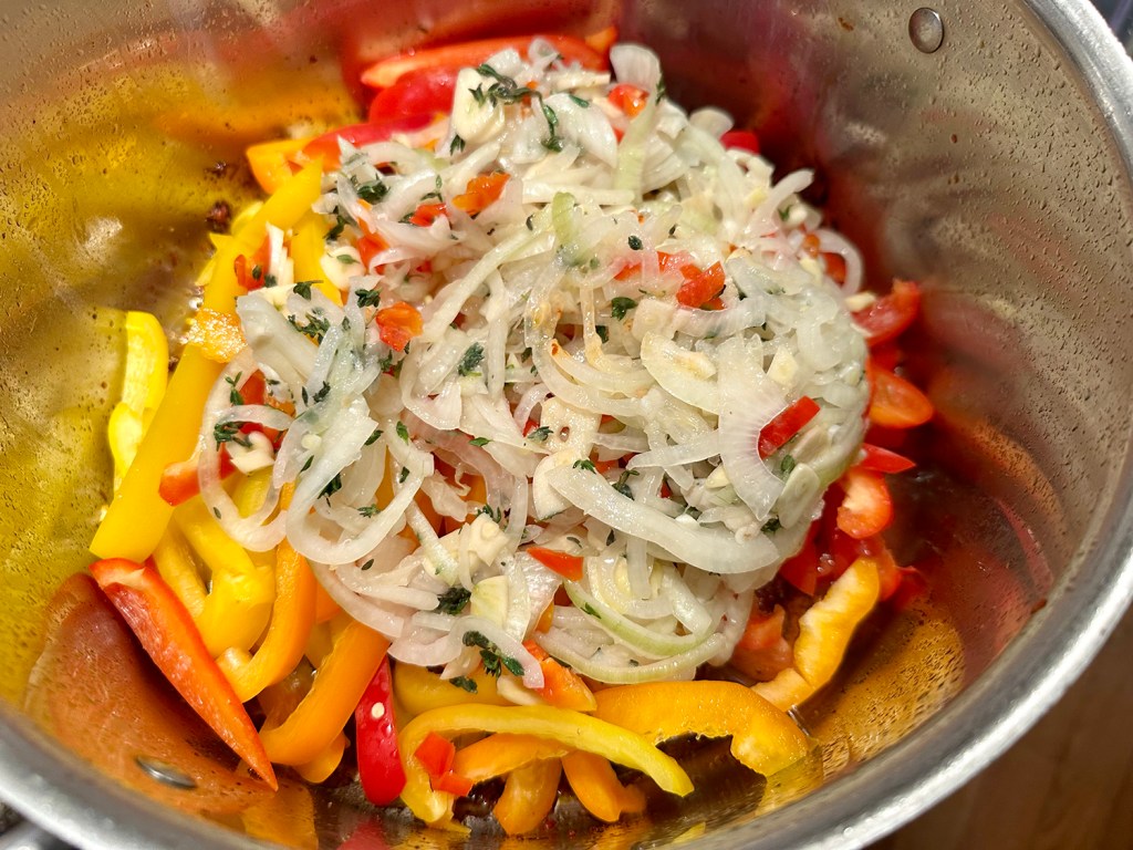 - Add the remaining 2 tablespoon oil to the skillet and when hot, add the onions and chopped peppers and cook until beginning to soften, 3 to 4 minutes. Add the garlic and cook for another minute.