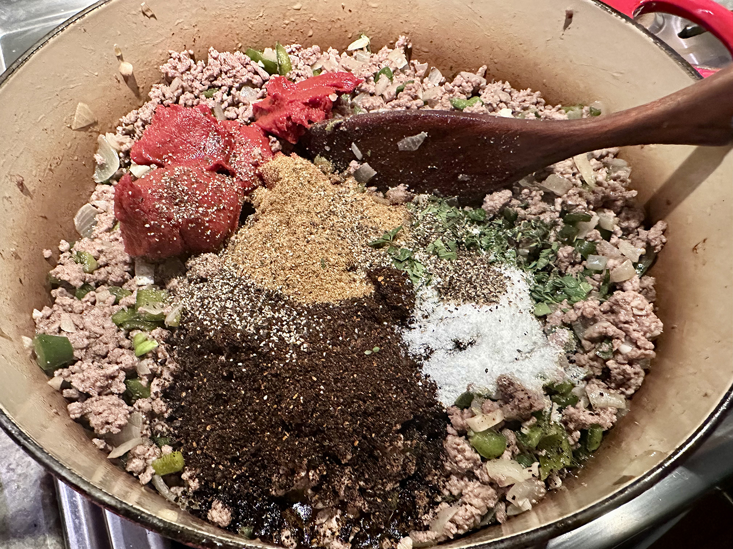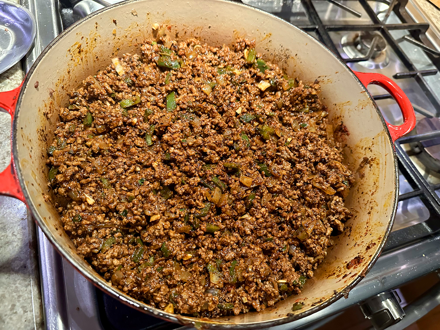 - Heat the oil in a large Dutch oven over medium. Add the onion, season with salt, and cook, stirring occasionally, until the onion is softened and translucent, about 8 minutes. Increase the heat to medium-high, add the beef and garlic, season with salt and cook, breaking the beef into crumbles with a spatula, until the beef has lost its pink color and some of the liquid has evaporated, about 10 minutes.