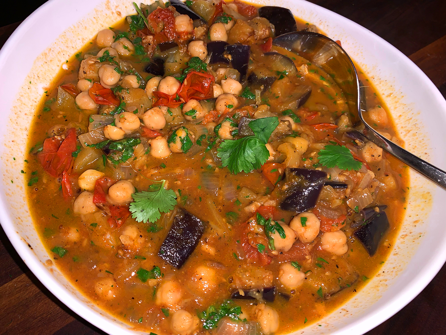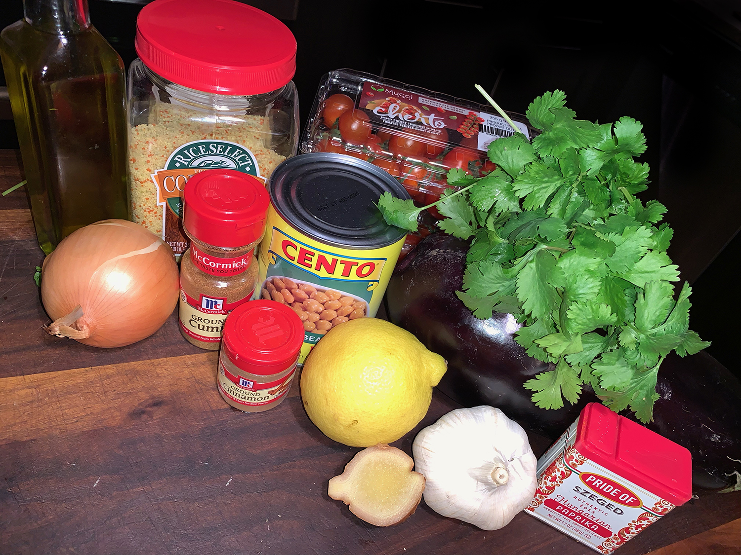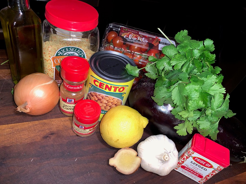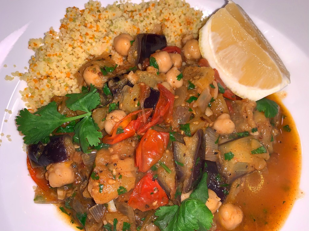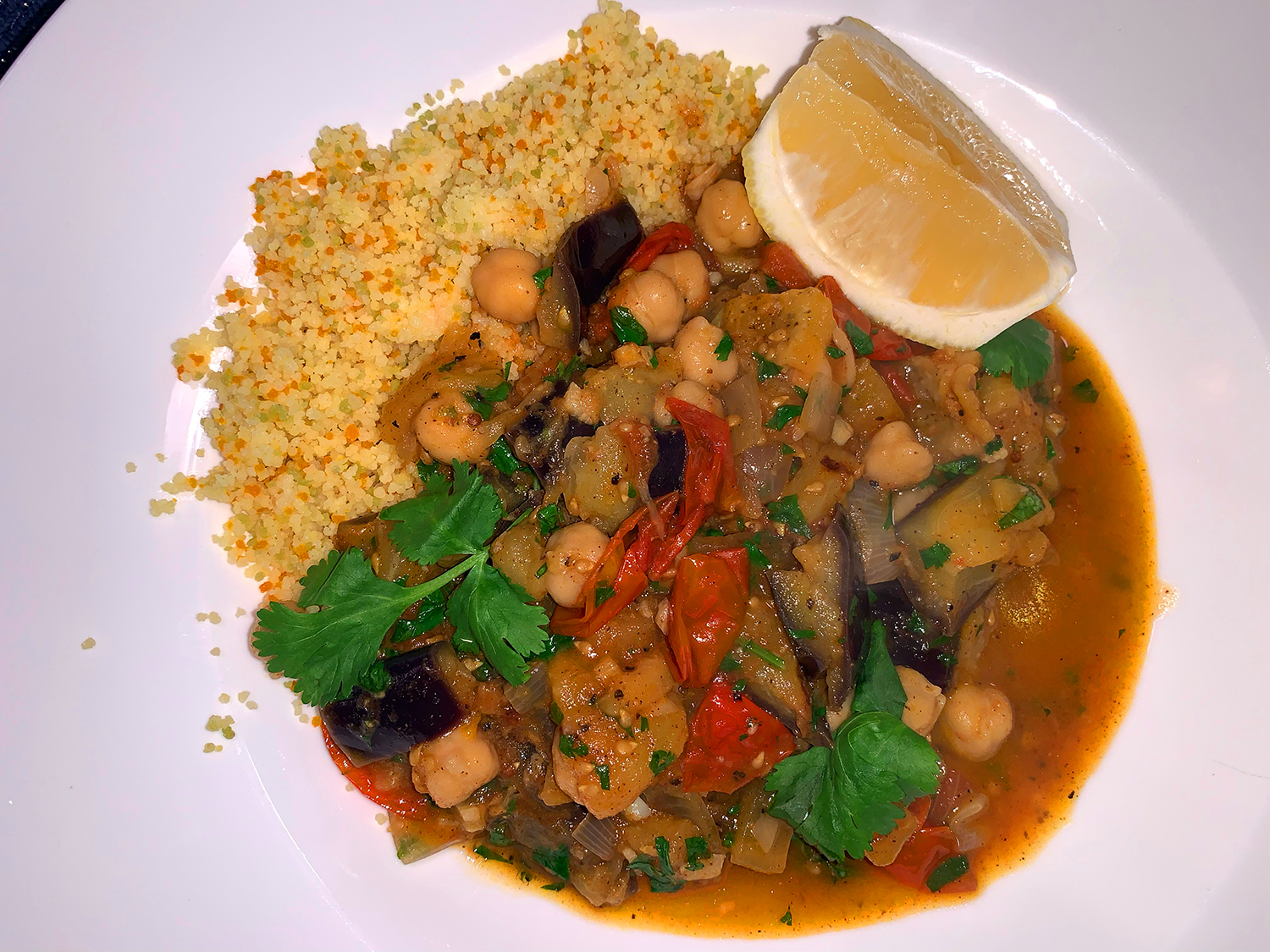 This amazing recipe addresses several dietary restraints such as gluten-free, vegan, vegetarian, and high-fiber, but does not lack in flavor! It is a simple, delicious tagine recipe with eggplant and chickpeas infused with Moroccan spices served over cinnamon-scented couscous.
