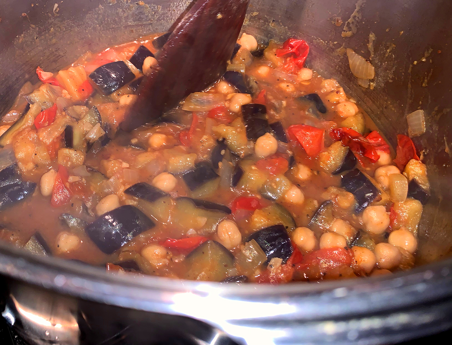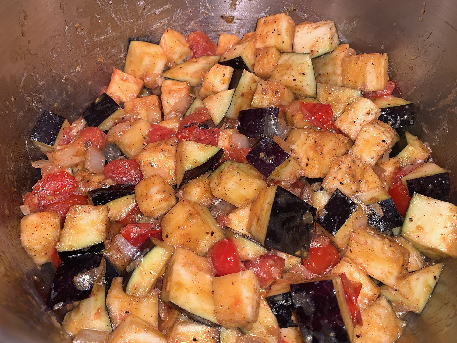 - Nestle in the eggplant and give the pan a good shake so the stew levels. It should be like a stew-like. If it seems dry, add a little water. Drizzle with a little olive oil, cover tightly and place in the warm oven.