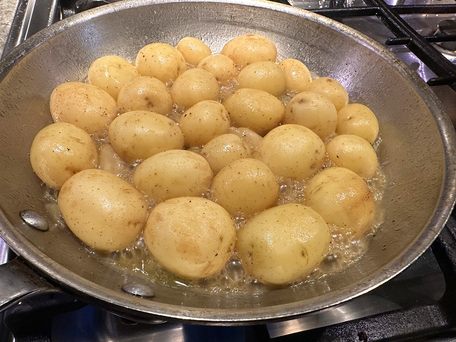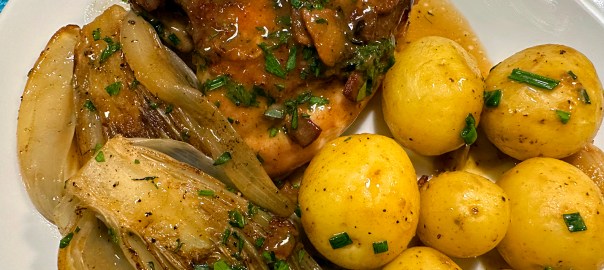 Finishing the chicken in the oven brings it up to temperature gently, so the thinner portions don’t dry out. It is fast and easy to reduce the juices left in the pan, creating a rich fond for the sauce that doesn’t require boxed broth.