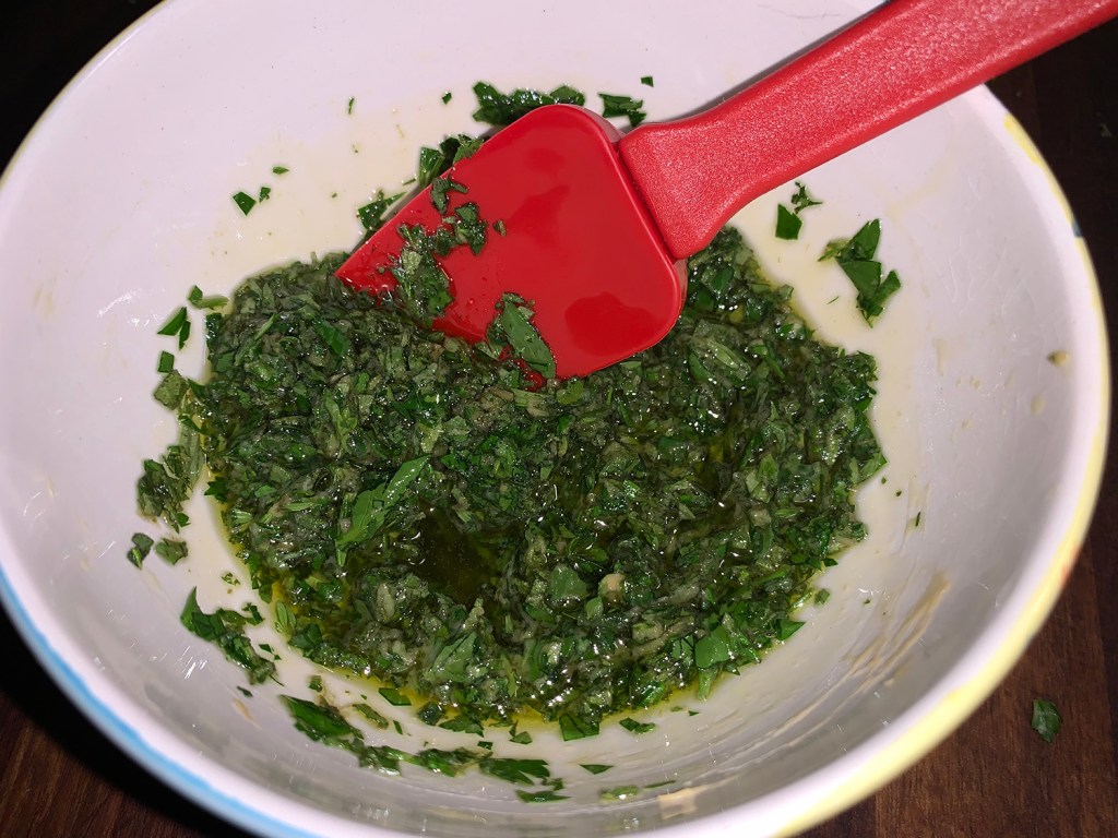 One ingredient not included in the original recipe was garlic, so we included 4 cloves and mashed them in a large mortar with salt. Next we added the herbs (which we increased from 1/4 cup to a 1/2 cup since our roast was larger), and mashed it altogether to make a paste.