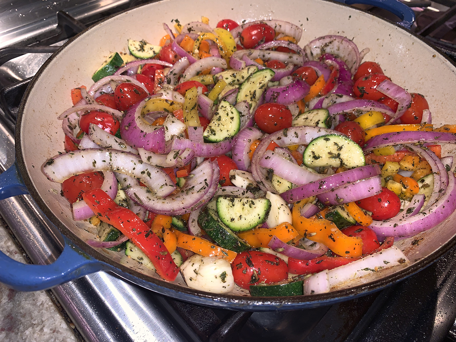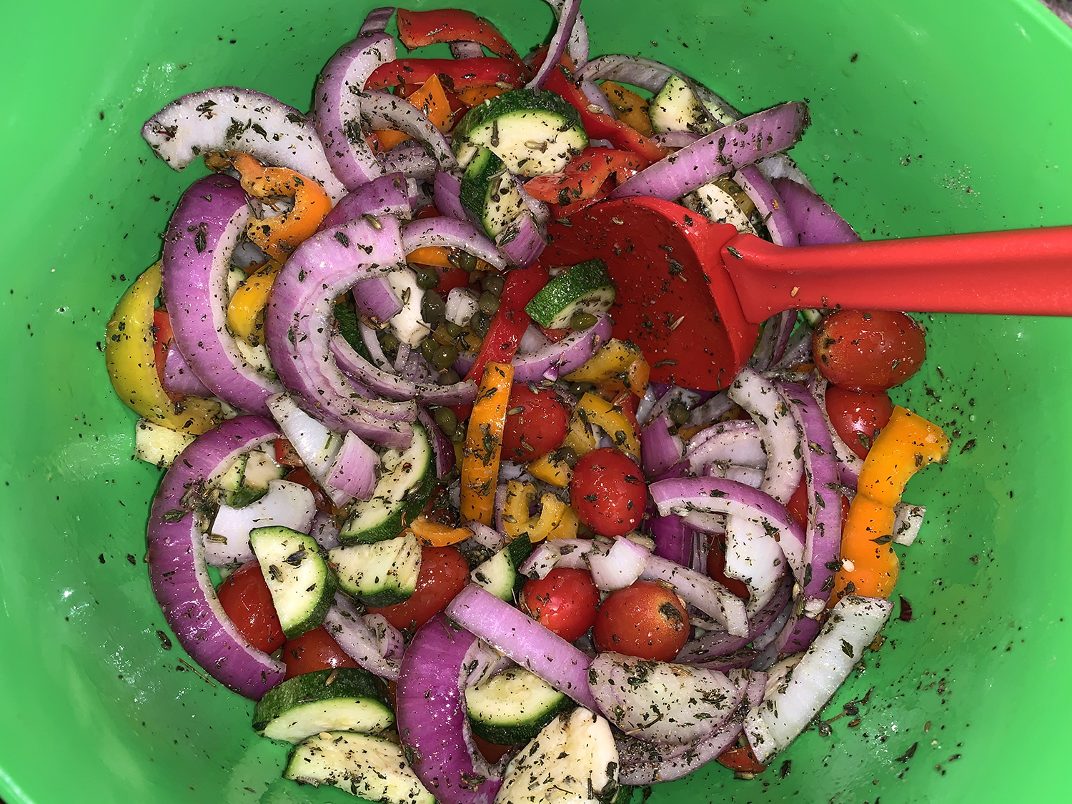 Before cooking, the veggies are tossed with herbes de Provence, an aromatic seasoning blend that typically includes rosemary, thyme, savory, marjoram and oregano, and sometimes other spices and herbs such as fennel, sage, lavender and tarragon.