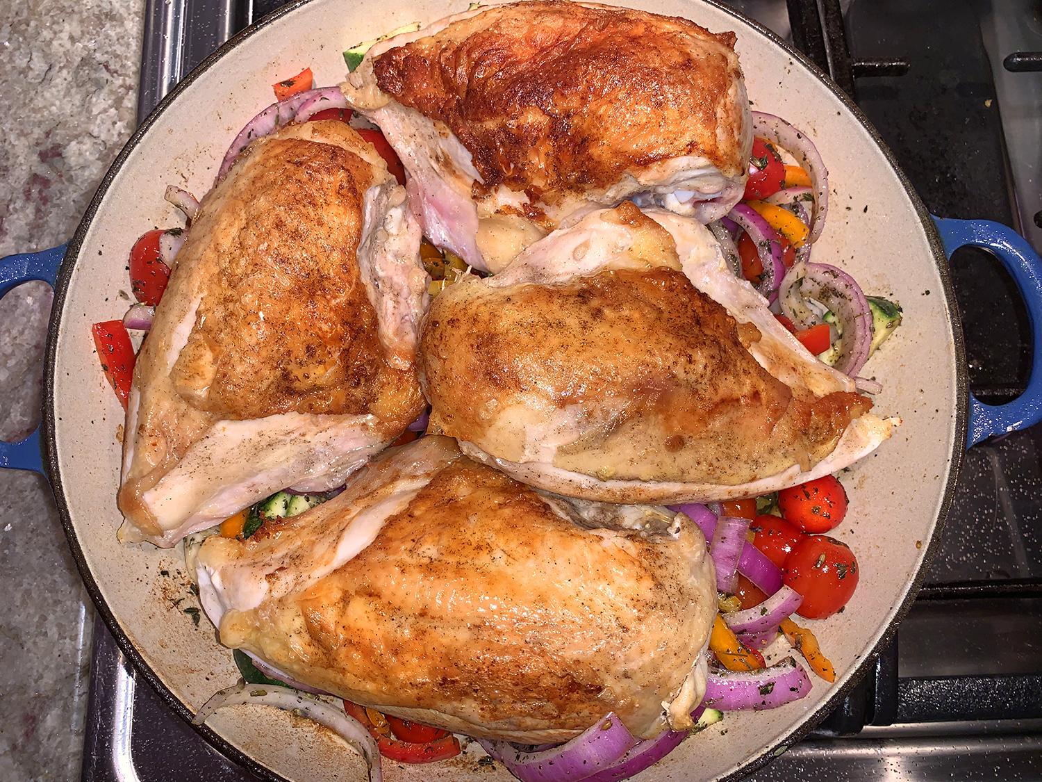 In this simple skillet dinner, the skin side of bone-in chicken breasts are seared, then roasted on top of a bed of sunny Mediterranean vegetables. Keep in mind, the recipe advises the use 12-ounce chicken breasts, using larger ones will require a longer cooking time and thus overcook the veggies. The only pieces available when we shopped weighed in at 18 ounces, 50% larger! (The first grocery store we visited, had no bone-in breasts at all.)