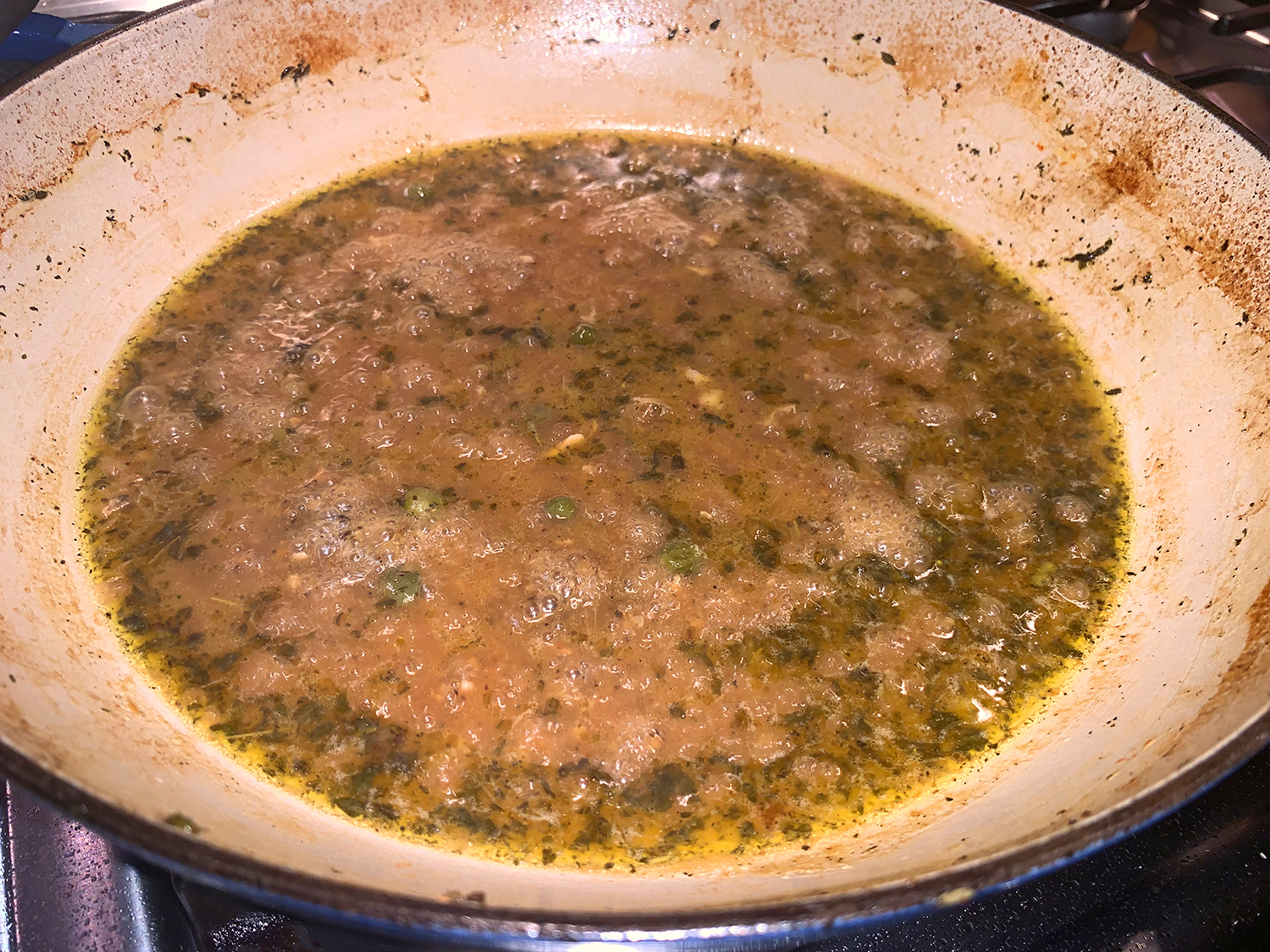 - Set the skillet over high, bring the liquid to a simmer and cook, stirring, until slightly thickened and reduced, 1 to 2 minutes. Off heat, stir in the caper brine, then taste and season with salt and pepper. Pour the sauce around the chicken and over the vegetables. Sprinkle with basil (if using).