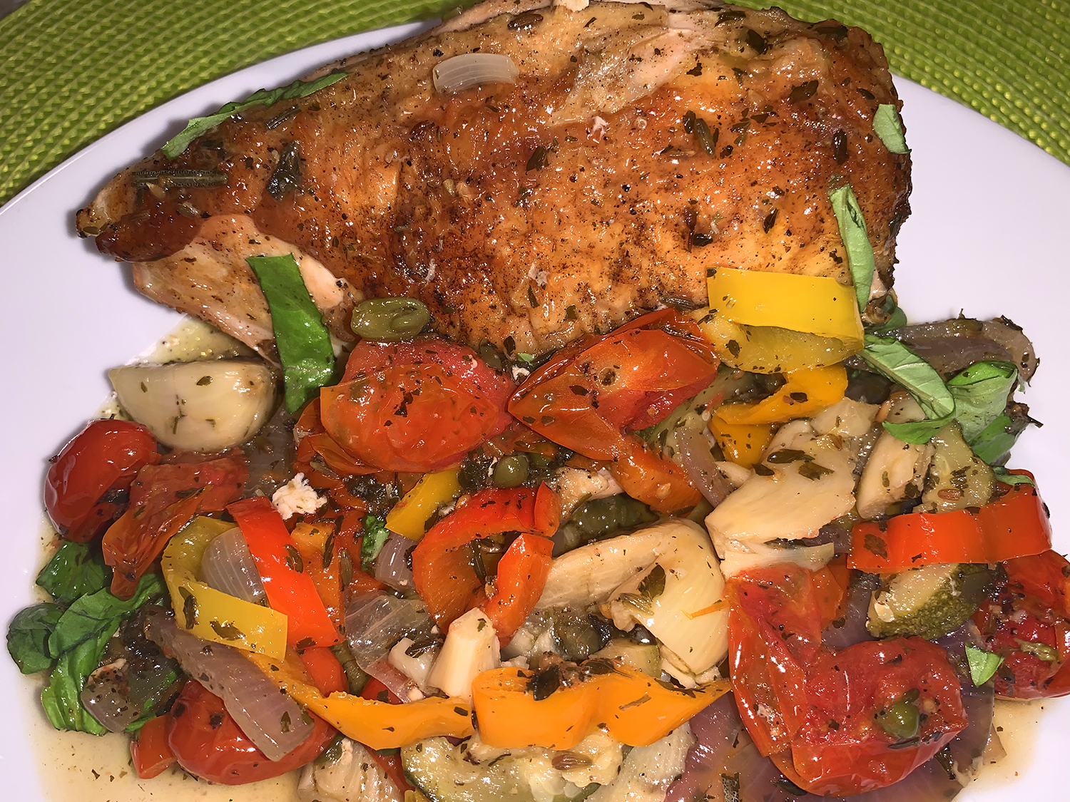 - Heat the oven to 475℉ with a rack in the middle position. Season the chicken on all sides with salt and pepper. In a large bowl, stir together 2 tablespoons of oil, the herbes de Provence, ¼ teaspoon salt and 1 teaspoon pepper. Add the garlic, onion, bell pepper, tomatoes, zucchini and capers, then toss to combine; set aside.
