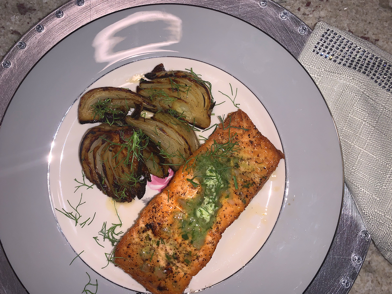 The idea for the butter mixture is that the heat from the salmon will melt just enough of the butter to sauce it lightly and leave a small amount unmelted so it’s apparent when served at the table. Our side dish of Roasted Fennel with Orange-Honey Dressing was a perfect complement to the salmon.