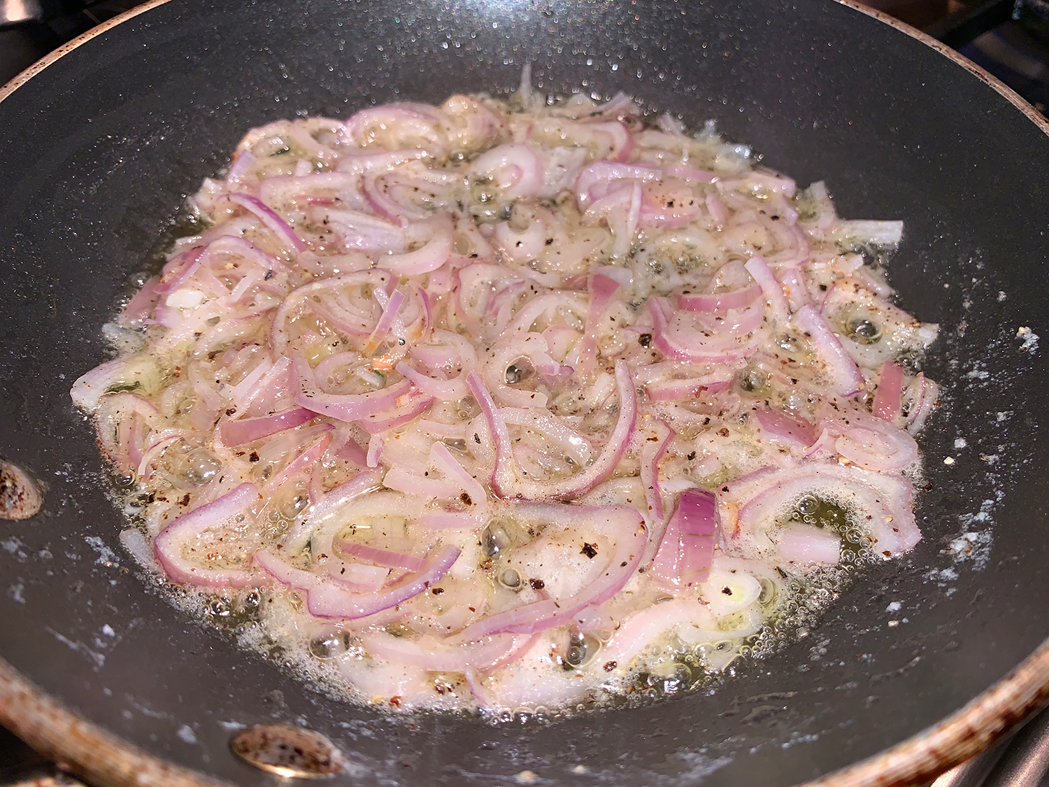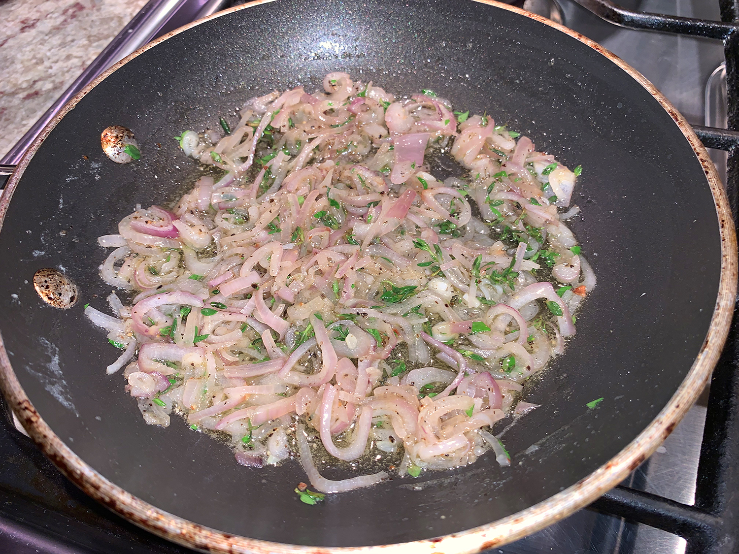 Return the pan to medium heat, add half of the remaining 1 1/2 tablespoons of butter and the minced shallot, and cook stirring frequently, until the shallot is tender, about 1 minute.