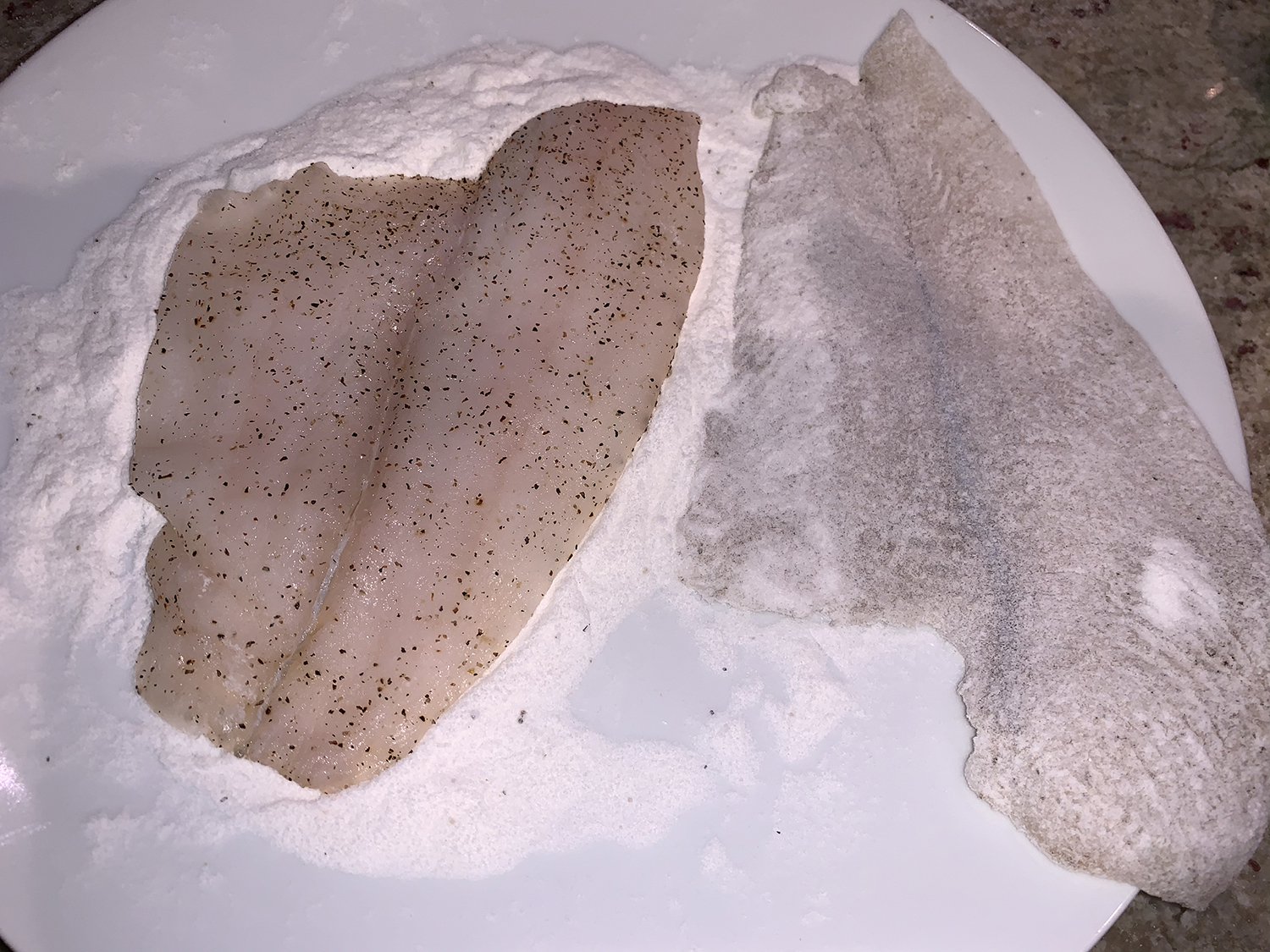 Increase the heat to medium-high, and add the oil to the skillet (use only half if cooking in two batches). When the oil shimmers, lower in the flounder. Drop the pieces of butter around the edges of the skillet, and as soon as it melts, tilt the pan to pool the butter and use a spoon to baste the fish. The butter will turn golden.