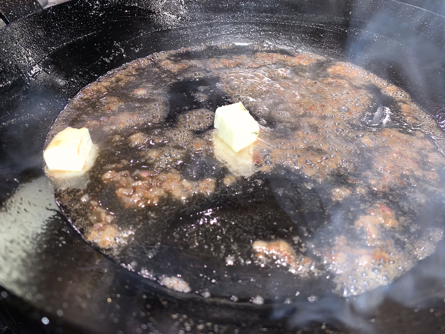 Give the skillet a cursory wipe to remove any excess fat, but don’t wash it.