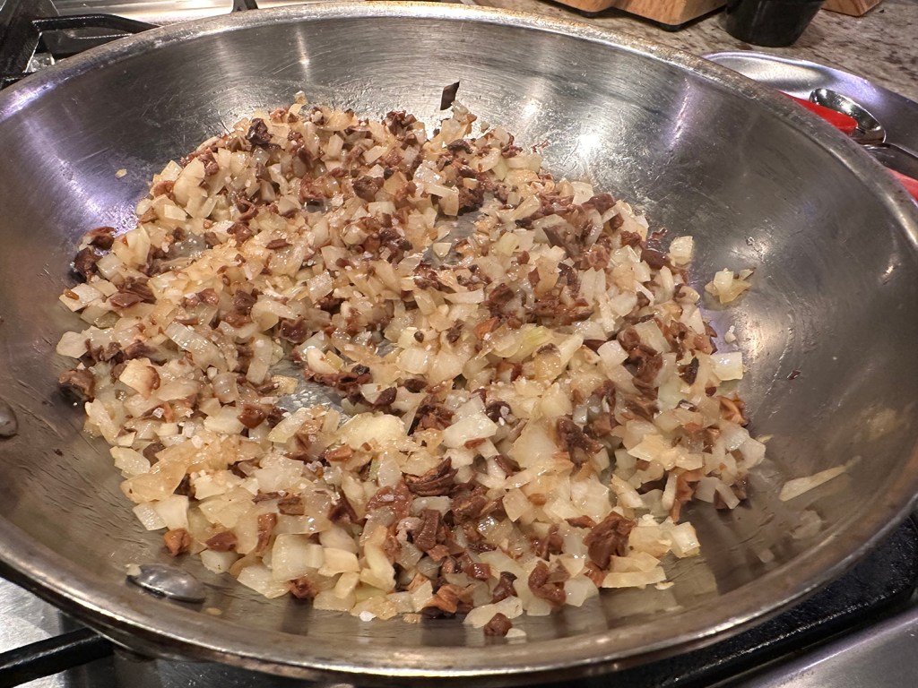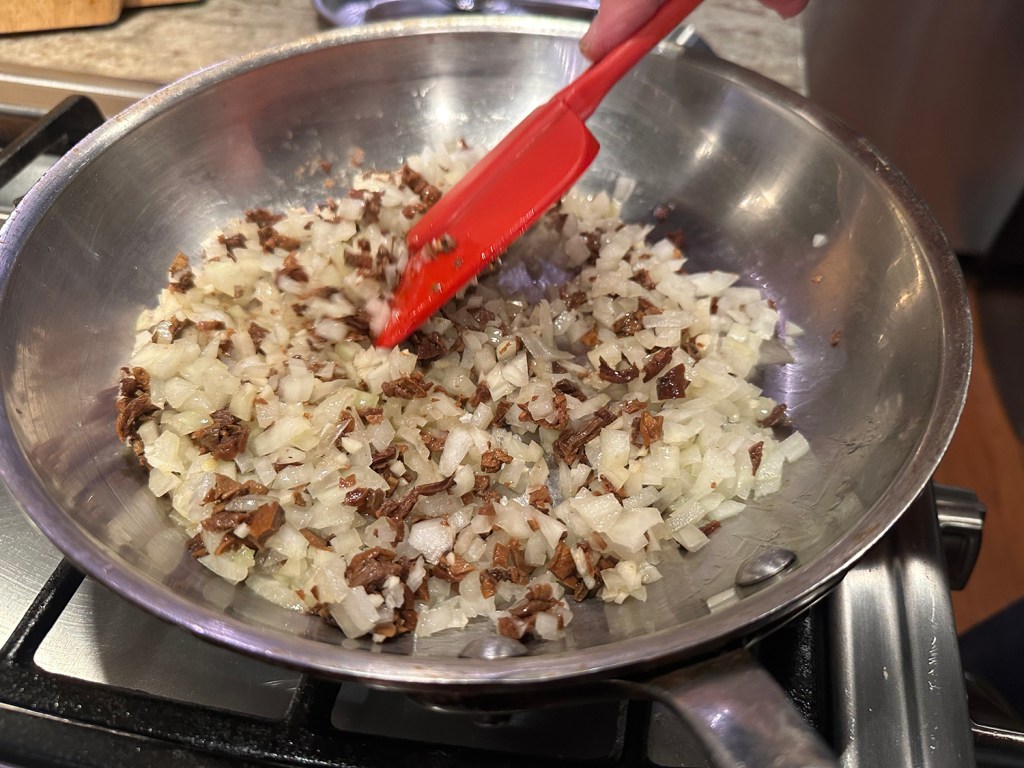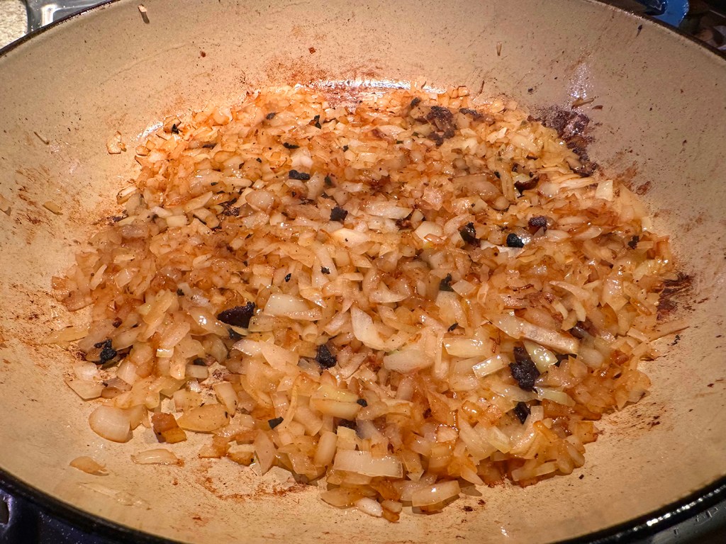 - Pour off all but 2 Tbsp. fat from pot; discard. Add 1 large onion, coarsely chopped, and ½ tsp. Diamond Crystal or ¼ tsp. Morton kosher salt and cook over medium-high, stirring occasionally, until onion is softened and starting to brown around edges, about 3 to 5 minutes.