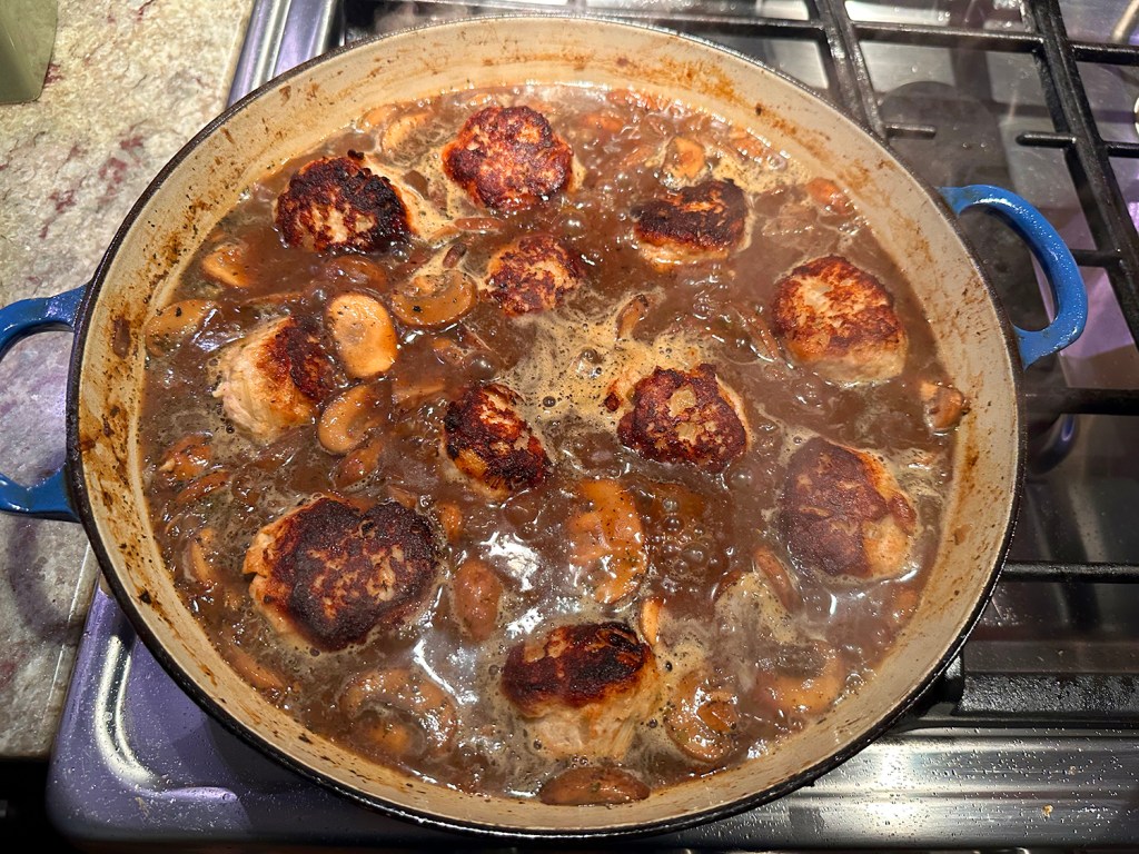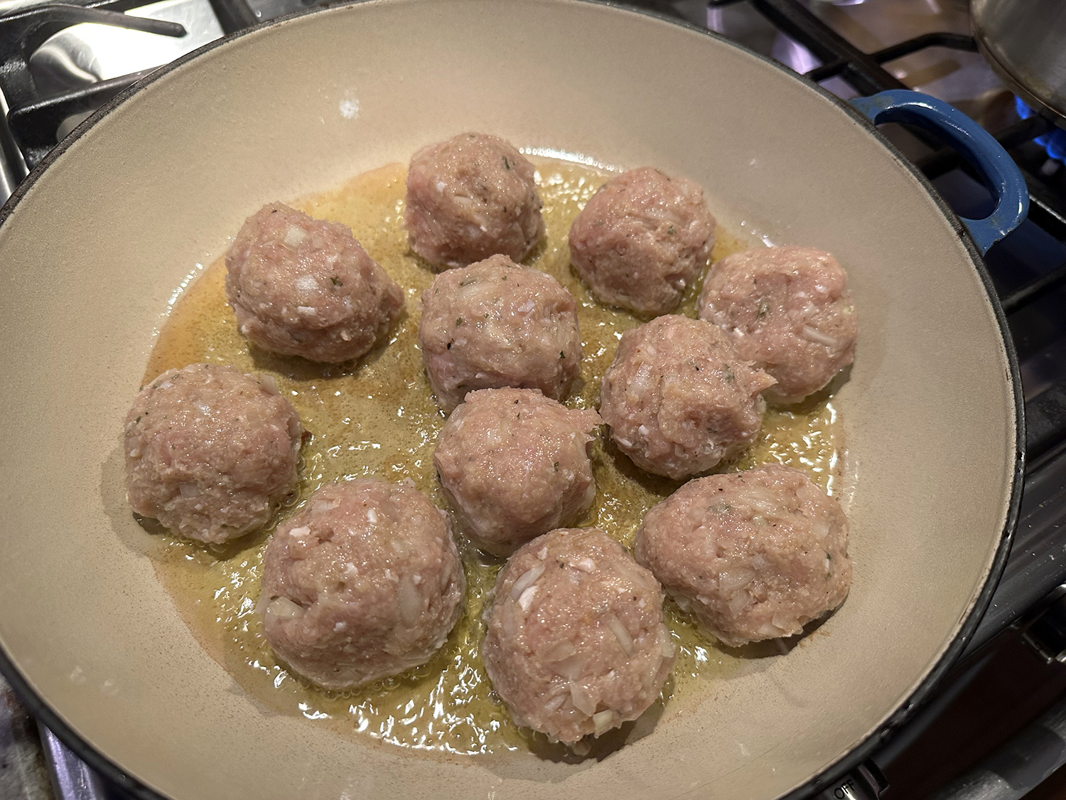 - Heat remaining 2 Tbsp. extra-virgin olive oil in a medium Dutch oven or other heavy pot over medium-high. Cook meatballs in a single layer, undisturbed, until browned underneath, about 3 minutes. Turn over and cook until browned underneath, about 3 minutes (they will not be cooked through). Using a slotted spoon, transfer meatballs to a plate.