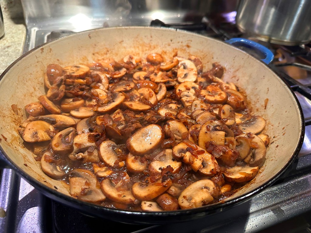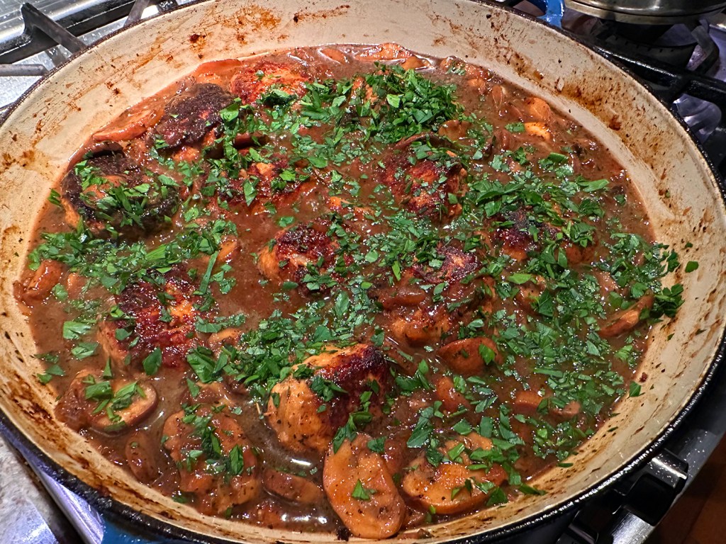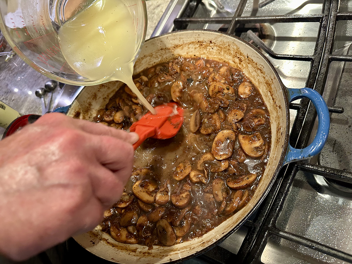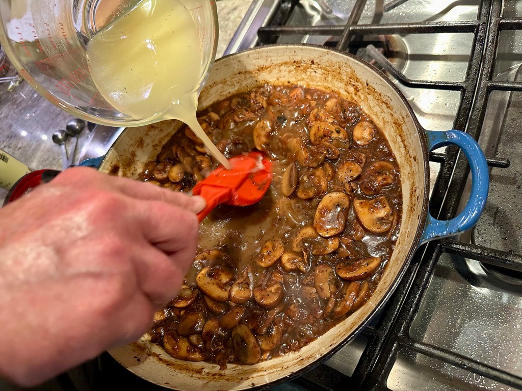 Incorporating dried dates instead of apricots (that’s what we had on hand), will result in a darker sauce. And we made our tri-colored couscous with homemade chicken stock for an additional bump of flavor.