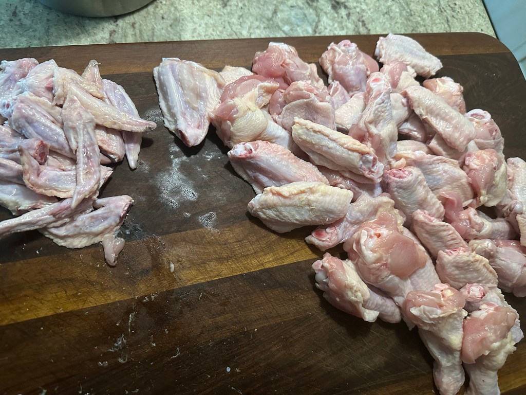 If you are starting with the full wings, you’ll need to break them down into drumettes, flats and tips. Either discard the tips or save and freeze them until such time you are ready to make homemade chicken stock. Then lay out the other pieces on doubled sheets of paper towels, top and bottom, pressing firmly as you go. If there is time, roll up the paper towels full of wing pieces and let sit to extract as much more moisture as possible.