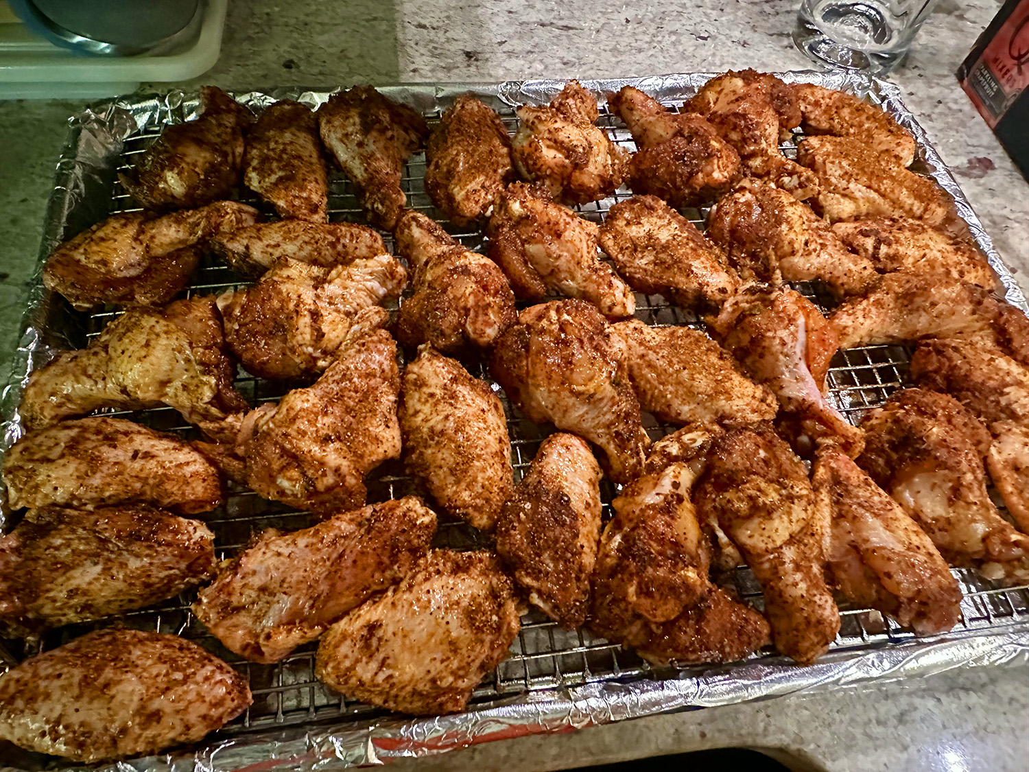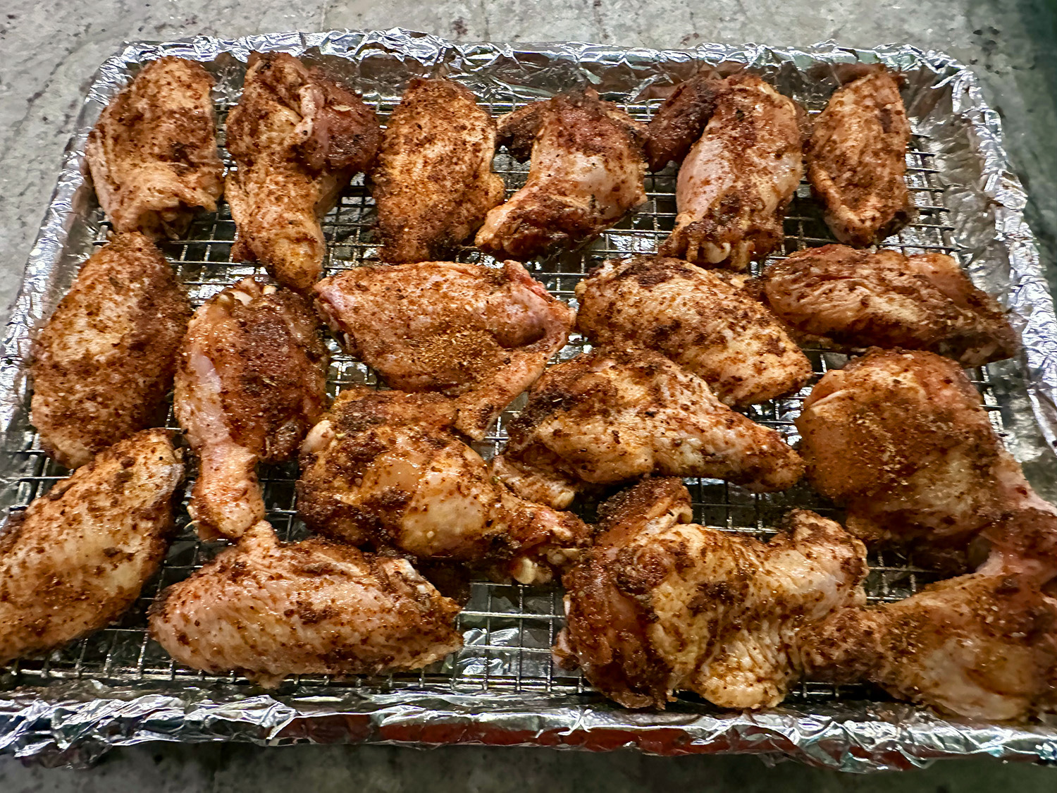 - Arrange wings on prepared rack, spacing evenly apart. Don’t crowd them. If you’re doubling or tripling this recipe, you’re going to need separate racks for all of them.