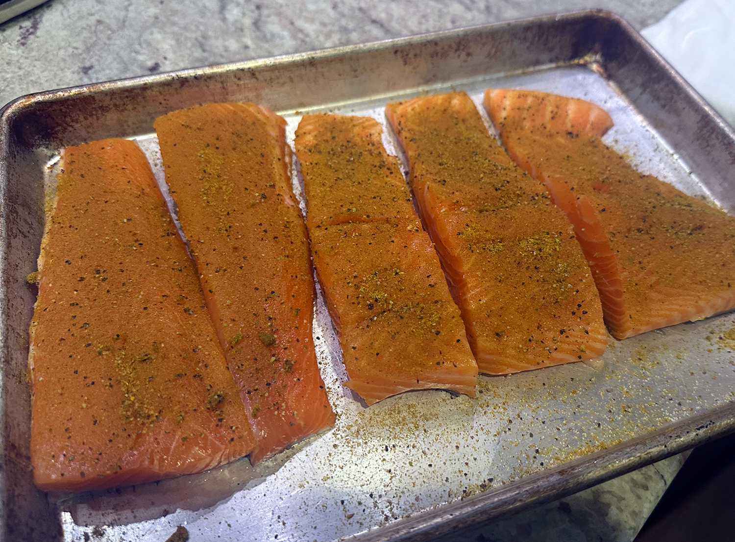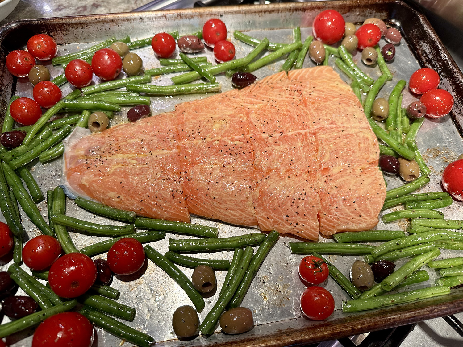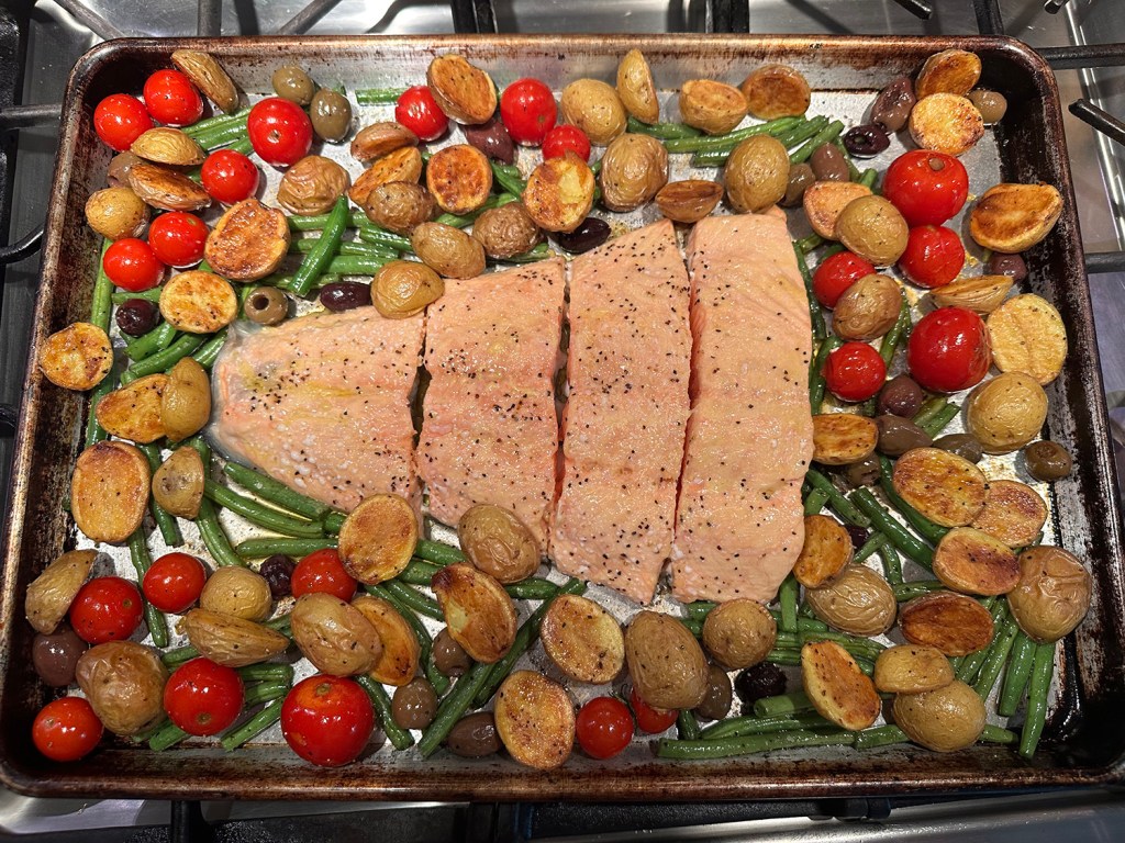 Our changes included slicing a 24-ounce slab of salmon into three 8-ounce portions. We also increased the amount of green beans from 8 ounces to 12 ounces (but then forgot to slice them into 2-inch pieces 😏).