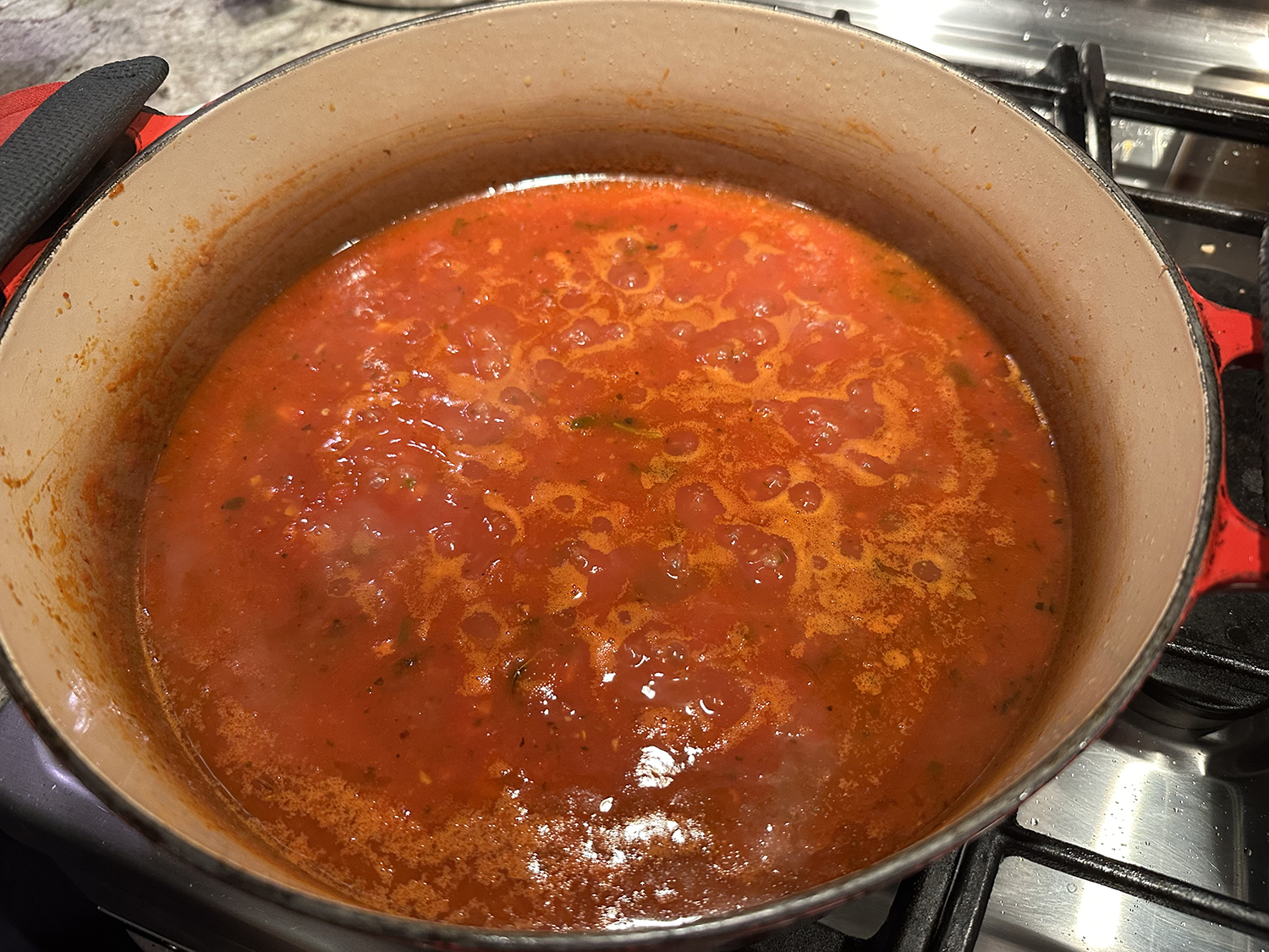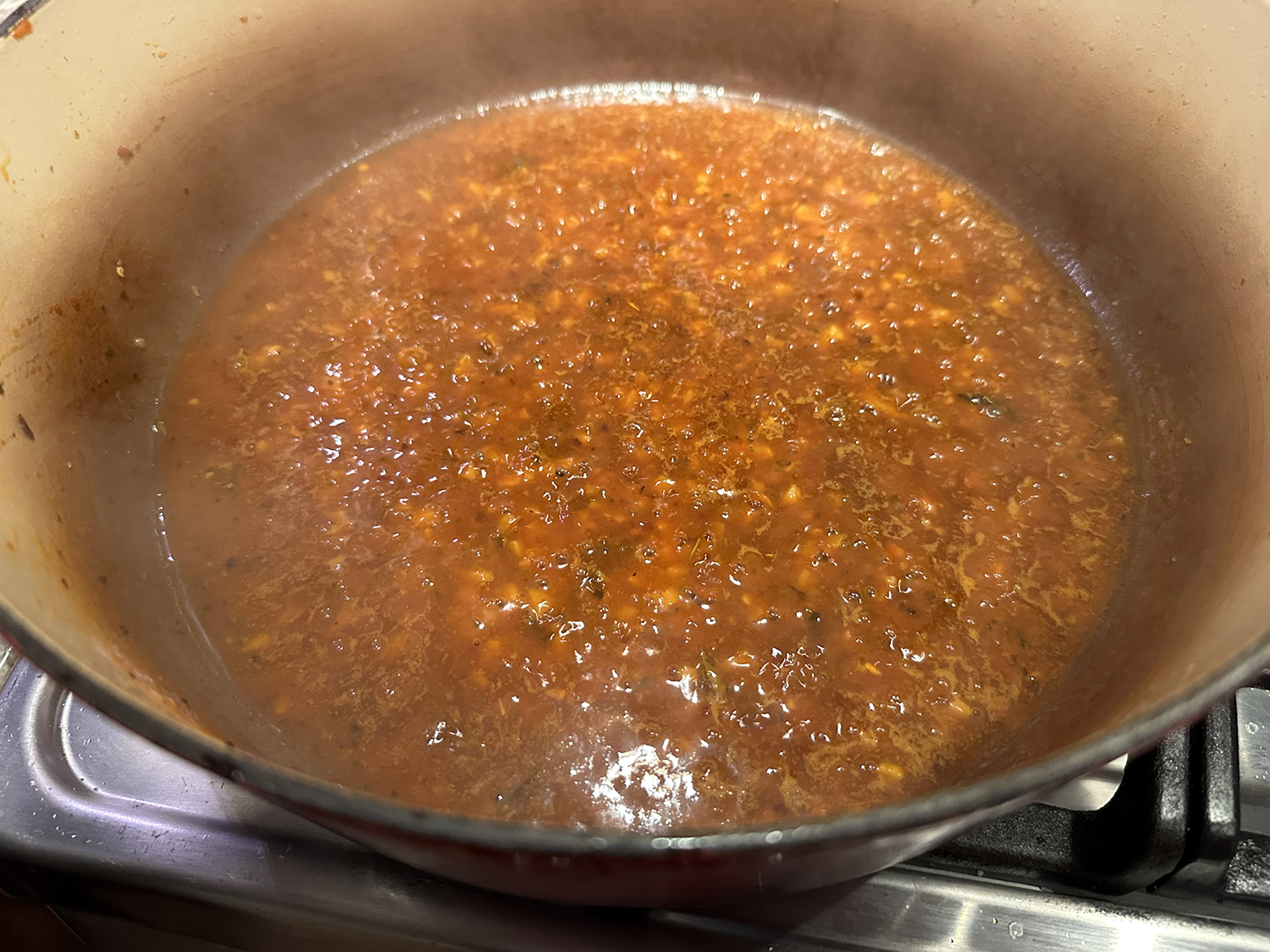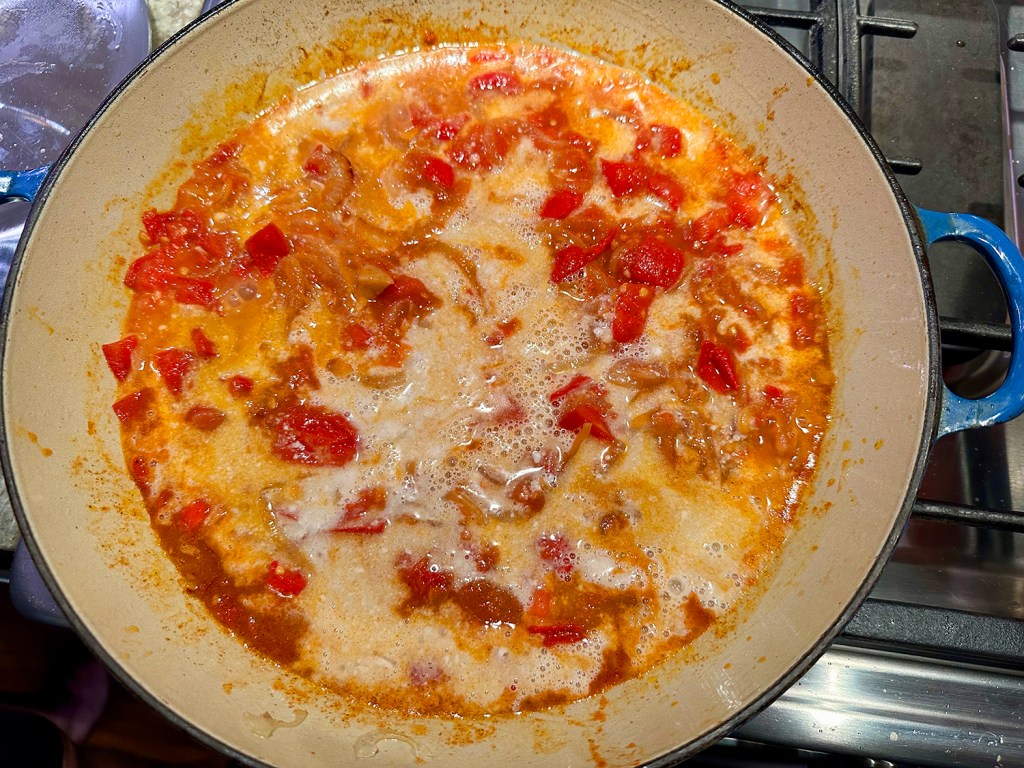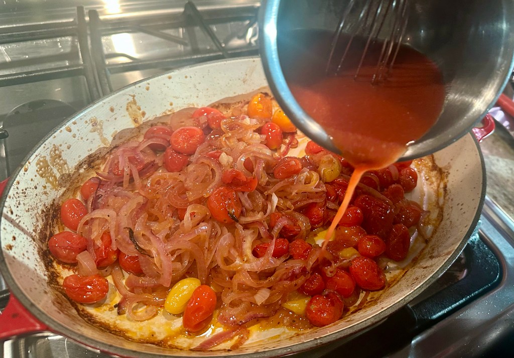 - Reduce heat to medium, pour the red pepper sauce into the skillet. Stir in ½ cup water and the remaining 2 tablespoons oil. Simmer the sauce, stirring frequently until slightly reduced and the liquid and oil collect toward the center of the skillet, 5 to 6 minutes. Taste for seasoning and adjust with additional salt and pepper if necessary.