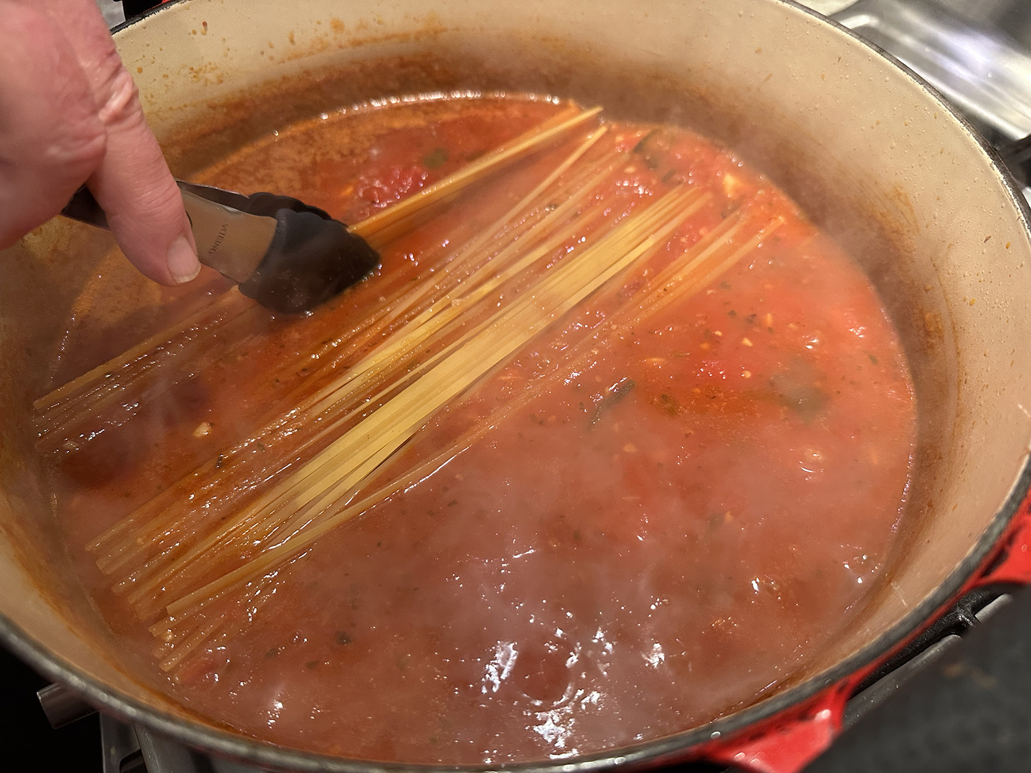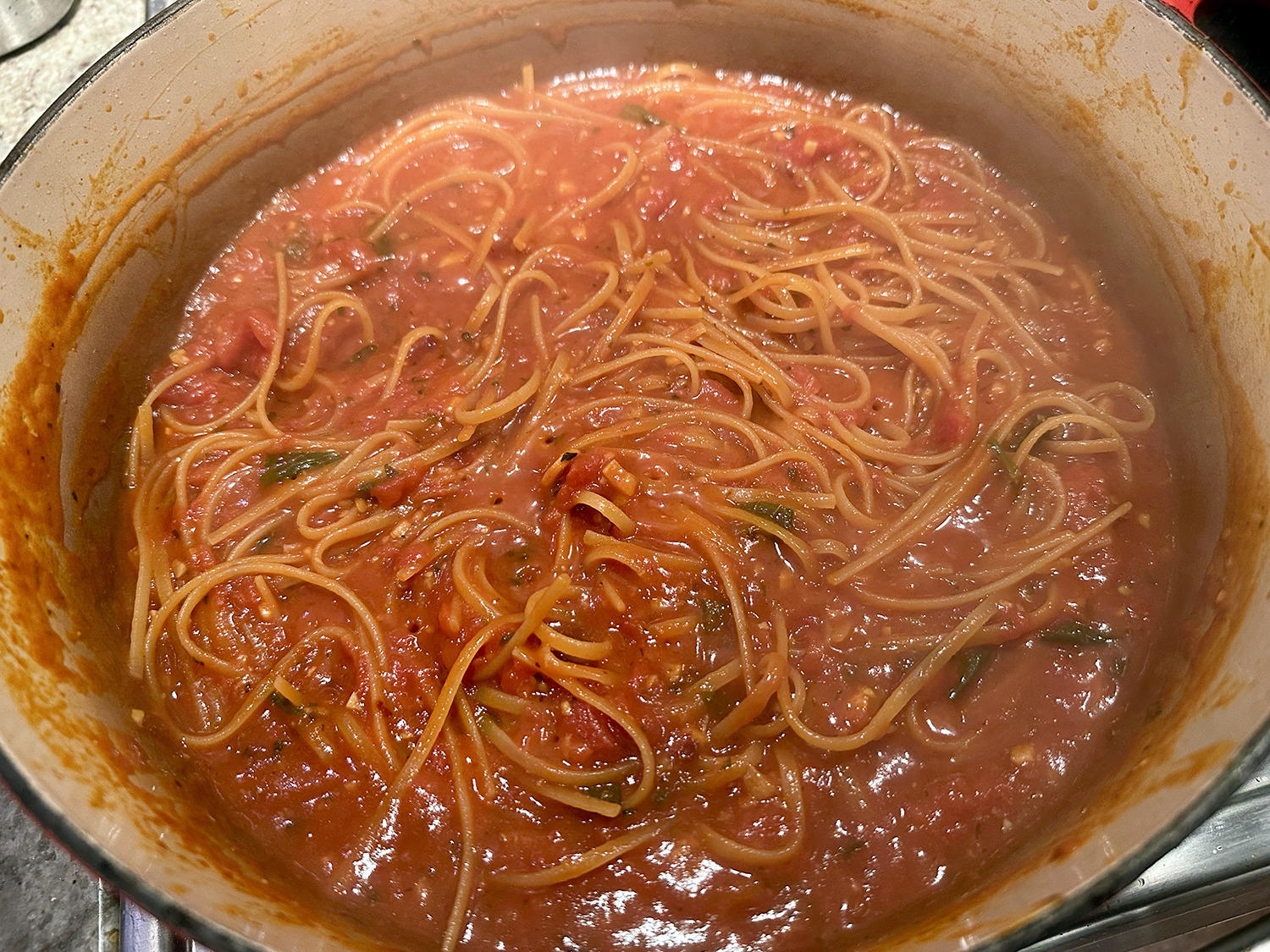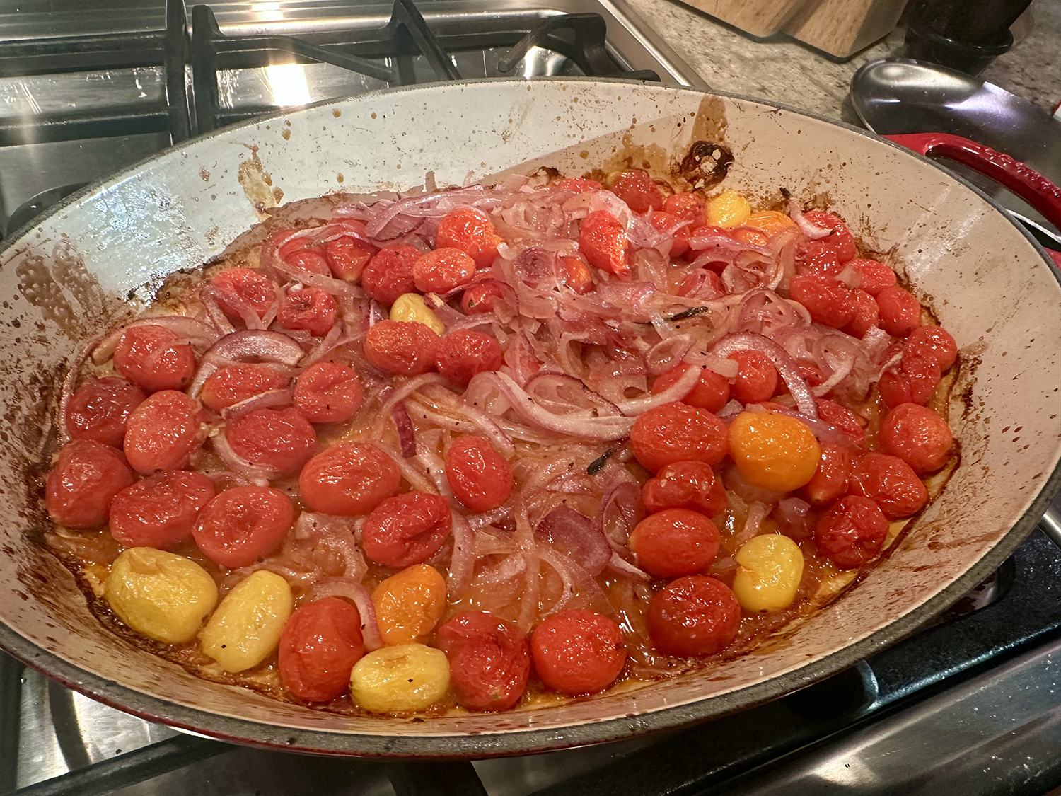 - Reduce heat to medium, pour the red pepper sauce into the skillet. Stir in ½ cup water and the remaining 2 tablespoons oil. Simmer the sauce, stirring frequently until slightly reduced and the liquid and oil collect toward the center of the skillet, 5 to 6 minutes. Taste for seasoning and adjust with additional salt and pepper if necessary.
