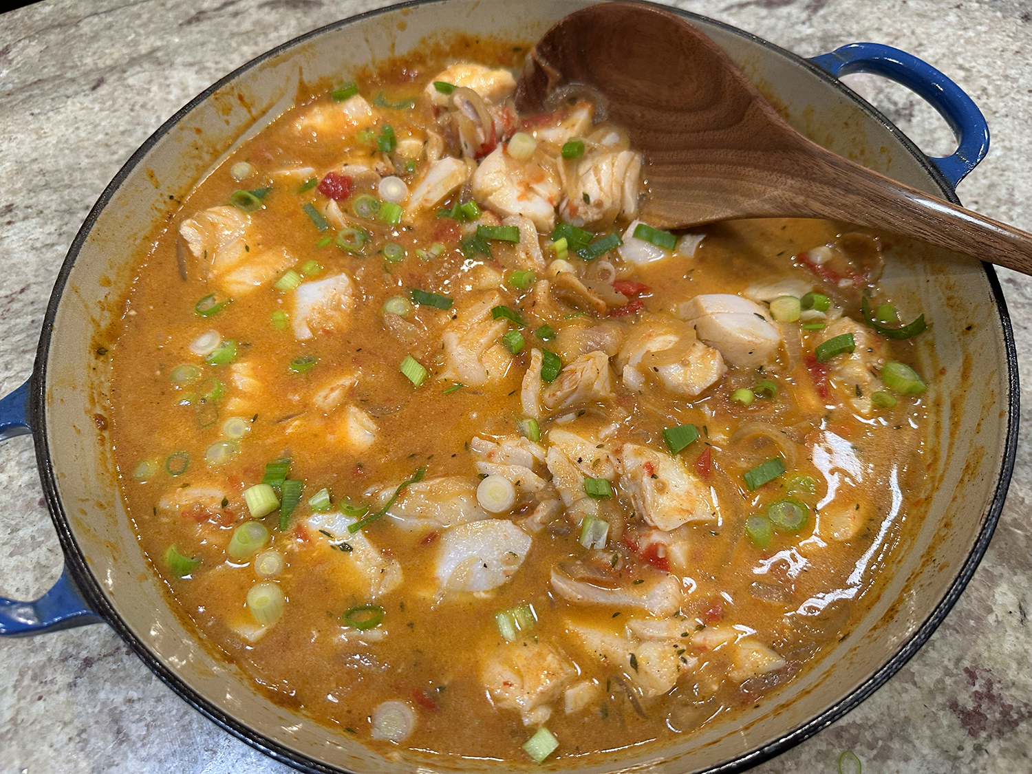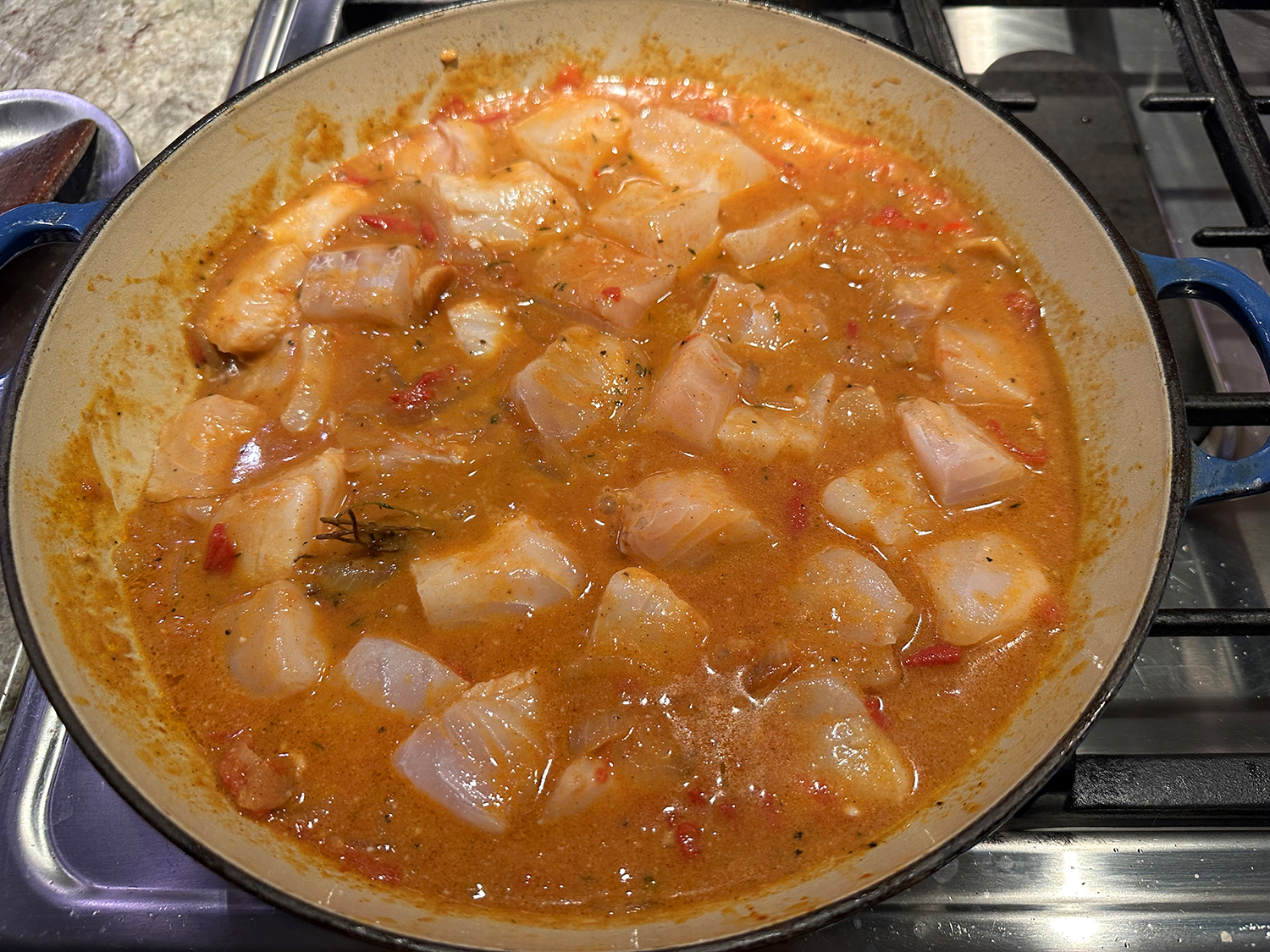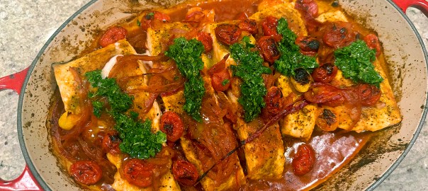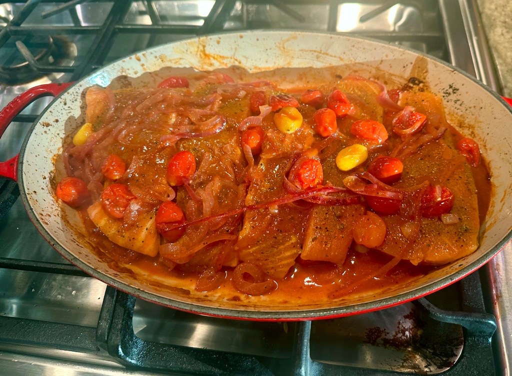 - Using a wooden spoon, create divots in the sauce and green beans. Nestle the fillets in the divots, skin side up. Cook until the fish is fork-tender, the sauce reduced and the green beans are softened, 6 to 8 minutes.