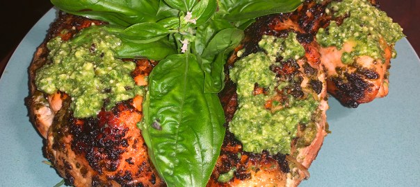 A lovely pescatarian meal utilizing a unique pesto which uses lot of fresh basil, and perhaps some fresh mint from your herb garden, or a local farmer’s market. And the citrus coming from a pink grapefruit is a novel approach, although we added the zest from one lemon also, to emphasize those welcome citrus notes.