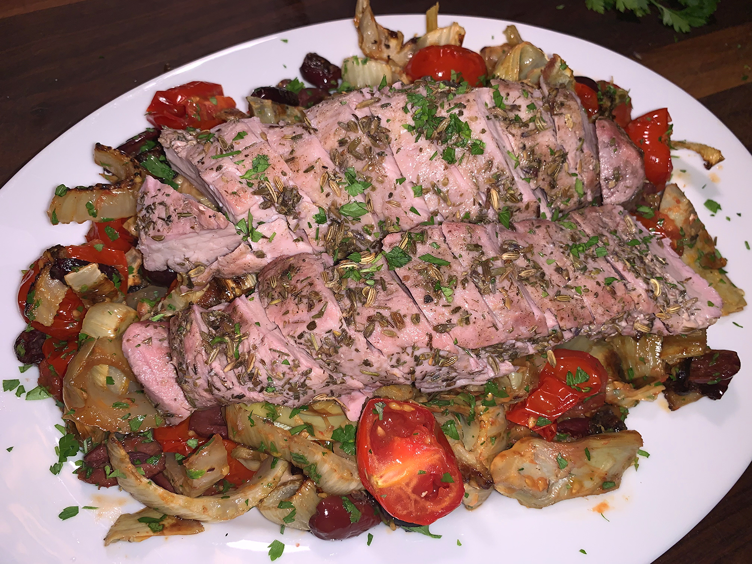 - Reheat pork briefly in a low (250-degree) oven, if necessary. Slice ¼-inch thick at an angle and spoon pan juices over. Surround with carrots and shower with snipped chives or scallions.