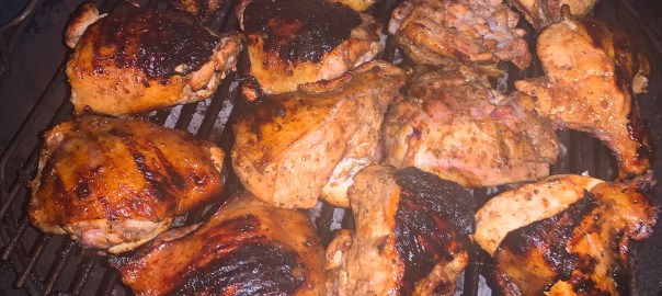 If you cook both breasts and legs, make sure to take the internal temperatures of the different parts and remove the pieces as they are done cooking, as white meat is done at about 160°F and dark meat at about 175°F. Don’t flip the chicken or place the pieces directly over the fire until final the minutes of cooking. The basting sauce contains a good dose of sugar and will burn if it gets too much direct heat.