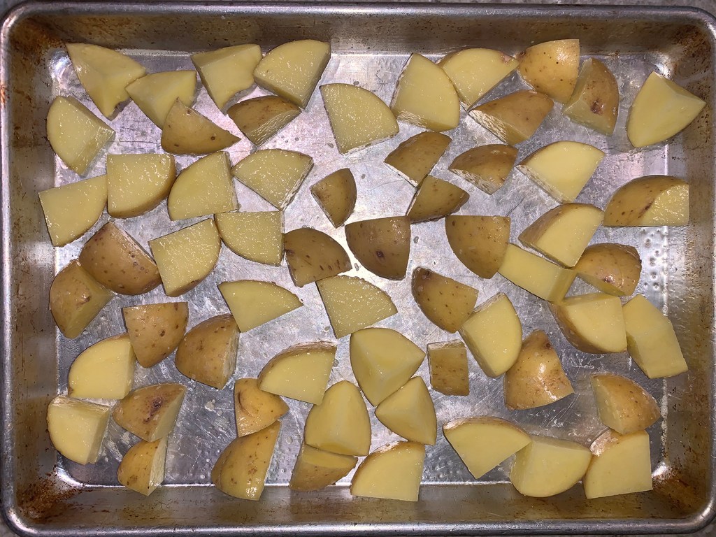 The original recipe called for mixed-color fingerling potatoes, but the grocery store was plum out of any type of fingerlings. However, there were some tri-colored baby spuds available. And I mean “baby” to the point of almost preemies! Thus I knew the cooking time was going to be drastically reduced.