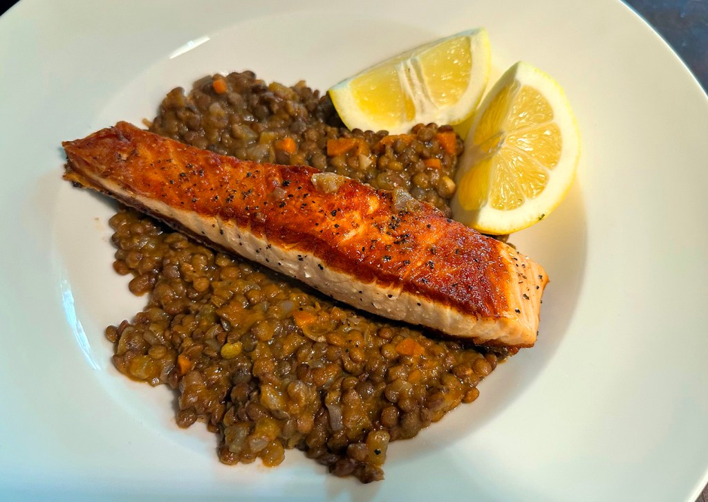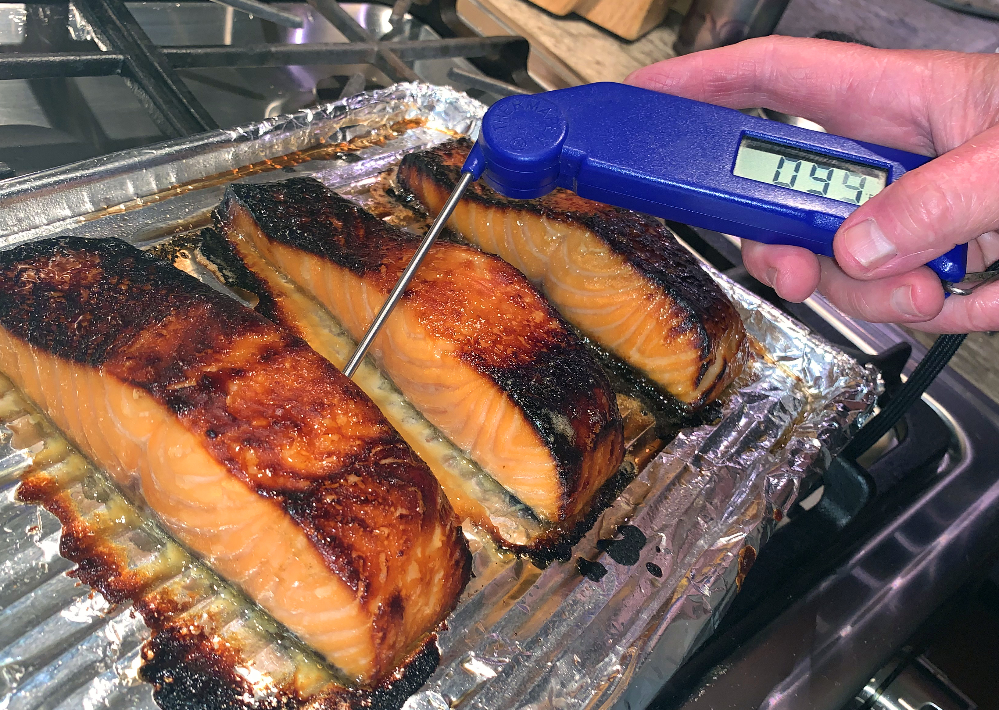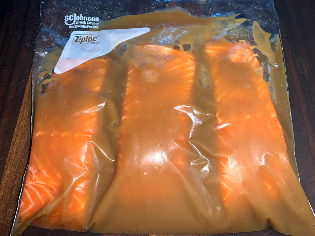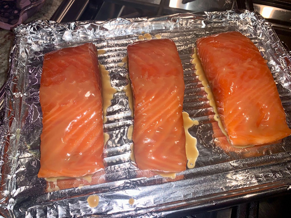 Our changes included slicing a 24-ounce slab of salmon into three 8-ounce portions. We also increased the amount of green beans from 8 ounces to 12 ounces (but then forgot to slice them into 2-inch pieces 😏).