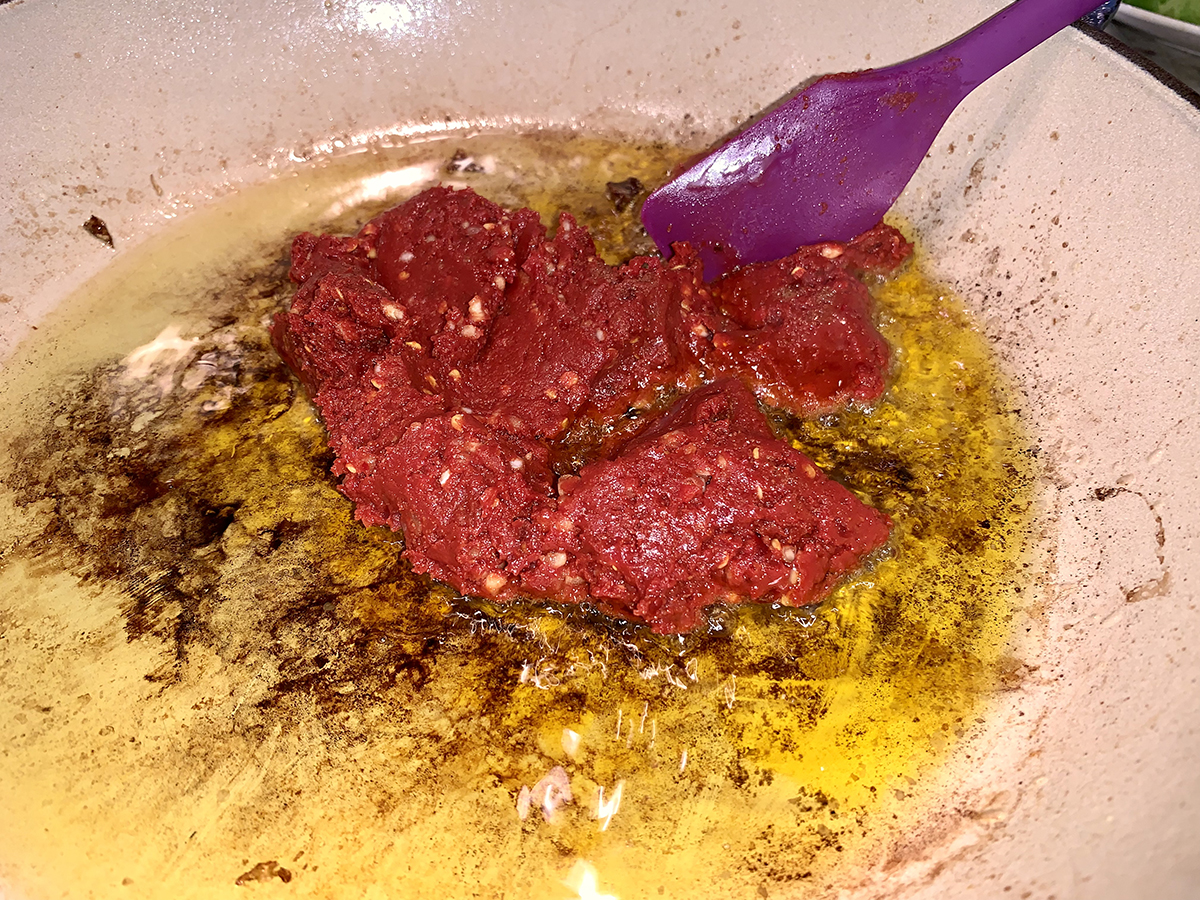If the spiced tomato paste has reduced and the pan starts getting dry and dark before the cabbage is ready, just add a splash of water to loosen and let it keep going.