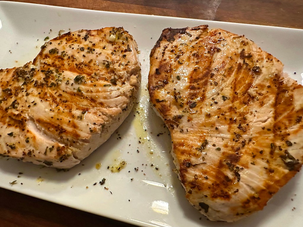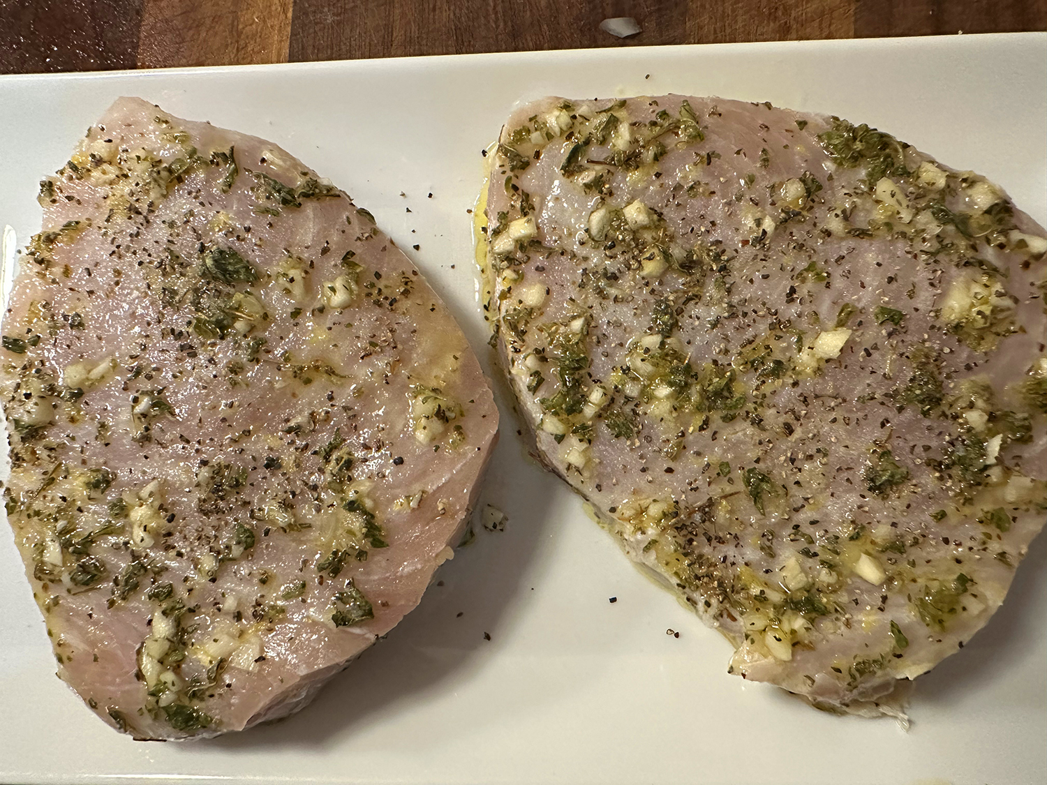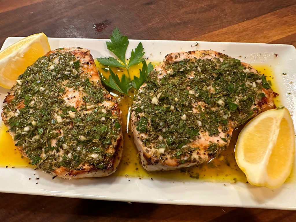 A lovely pescatarian meal utilizing a unique pesto which uses lot of fresh basil, and perhaps some fresh mint from your herb garden, or a local farmer’s market. And the citrus coming from a pink grapefruit is a novel approach, although we added the zest from one lemon also, to emphasize those welcome citrus notes.