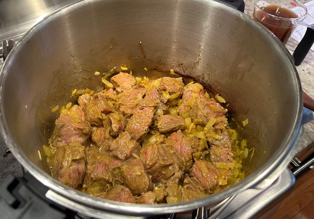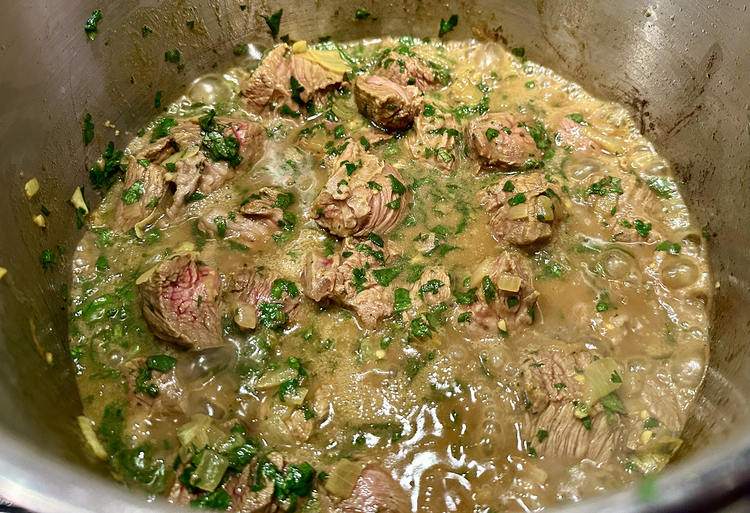 The original recipe produces a thin, watery liquid as the base while we prefer a thicker sauce. To accomplish this, you can either dredge the meat chunks in seasoned flour before browning them, and/or add a cornstarch slurry at the end, after degreasing (if necessary), but before adding cilantro.