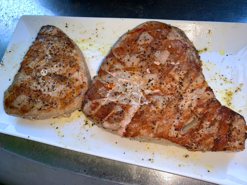 - Add capers, olives, pepper flakes and wine. Bring to simmer. Add tuna steaks. Reduce heat to low. Cover and simmer for 10-15 minutes. Remove tuna and keep warm.