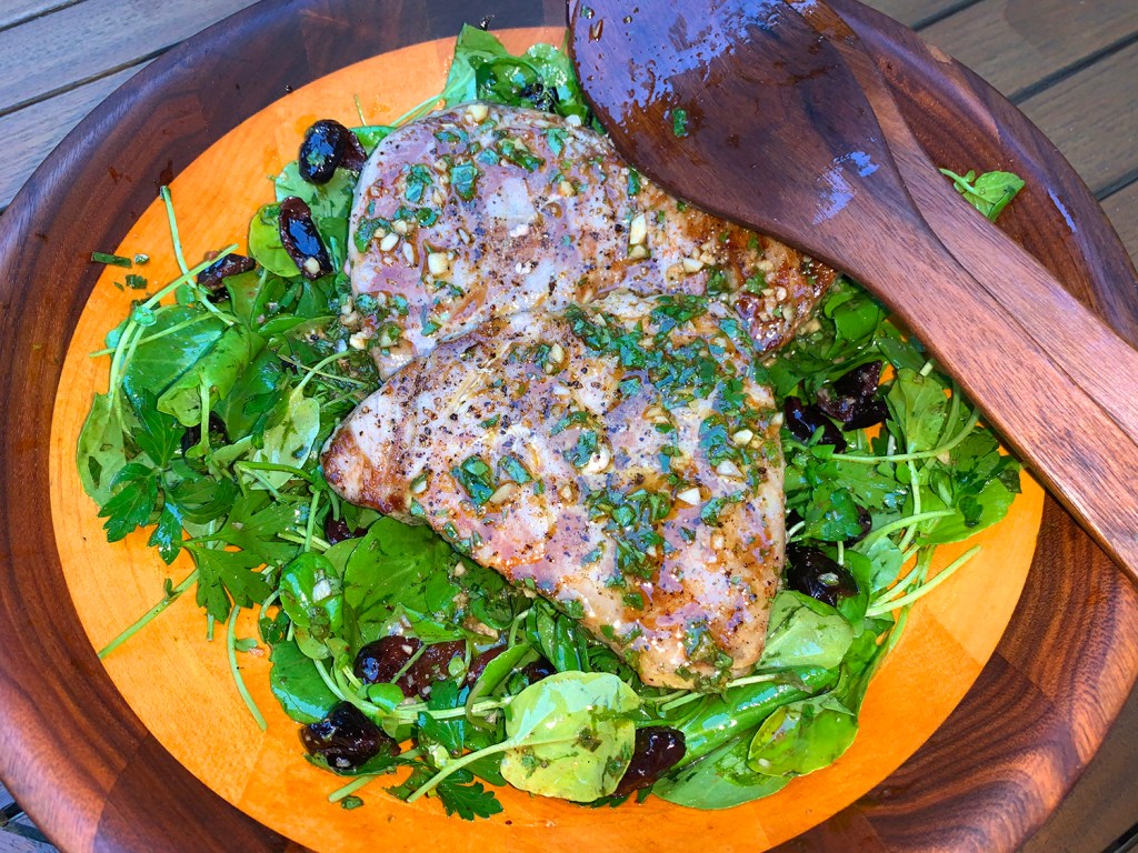 - Reduce sauce to desired consistency. Stir in cilantro. Serve tuna with warm sauce and sprinkle with slivered almonds.