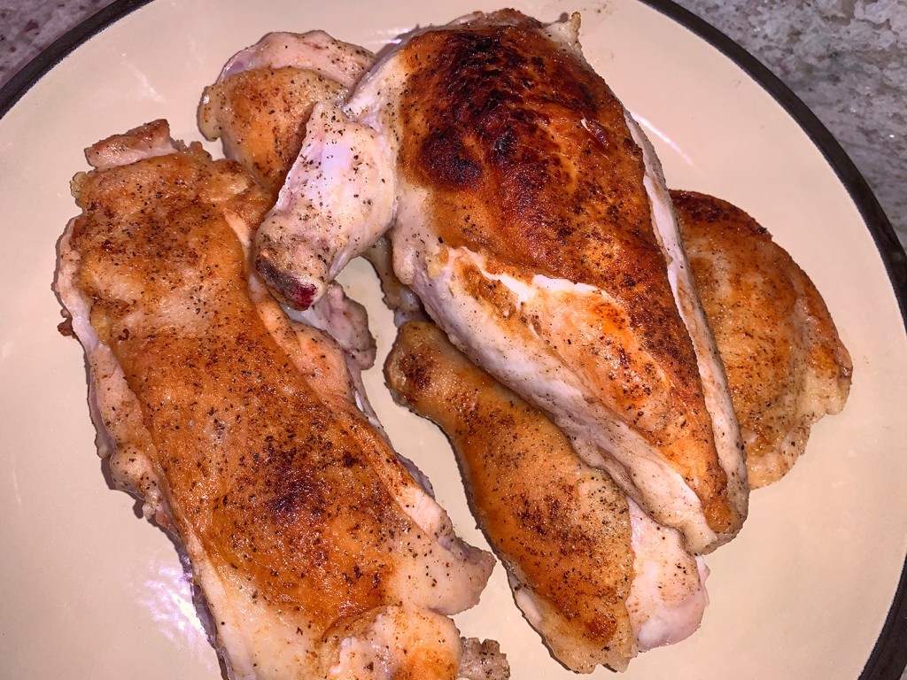 - Melt the butter in the pan and add the chicken, skin side down. Cover chicken with a plate that will fit comfortably inside the skillet. Place a heavy pot, stone or brick on top of the plate to weigh it down. Cook over low heat, checking the chicken skin, until it is nicely browned, about 25 minutes.