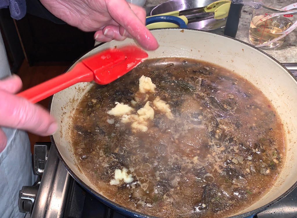 We took the liberty of enhancing the recipe with a few more aromatics including garlic and fresh thyme (noted below). Our variation when making the gravy, was to add 3 cloves of minced garlic along with the butter into the fat in the pan, cooking until fragrant.